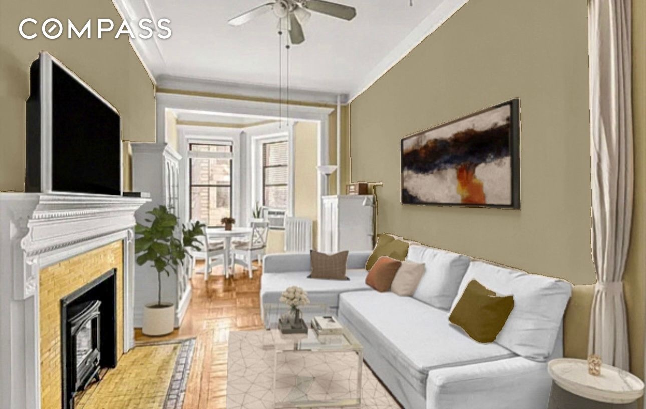The apartment boasts 10 ft high ceilings, a decorative fireplace, hardwood floors, and plenty of natural light pouring through oversized windows.