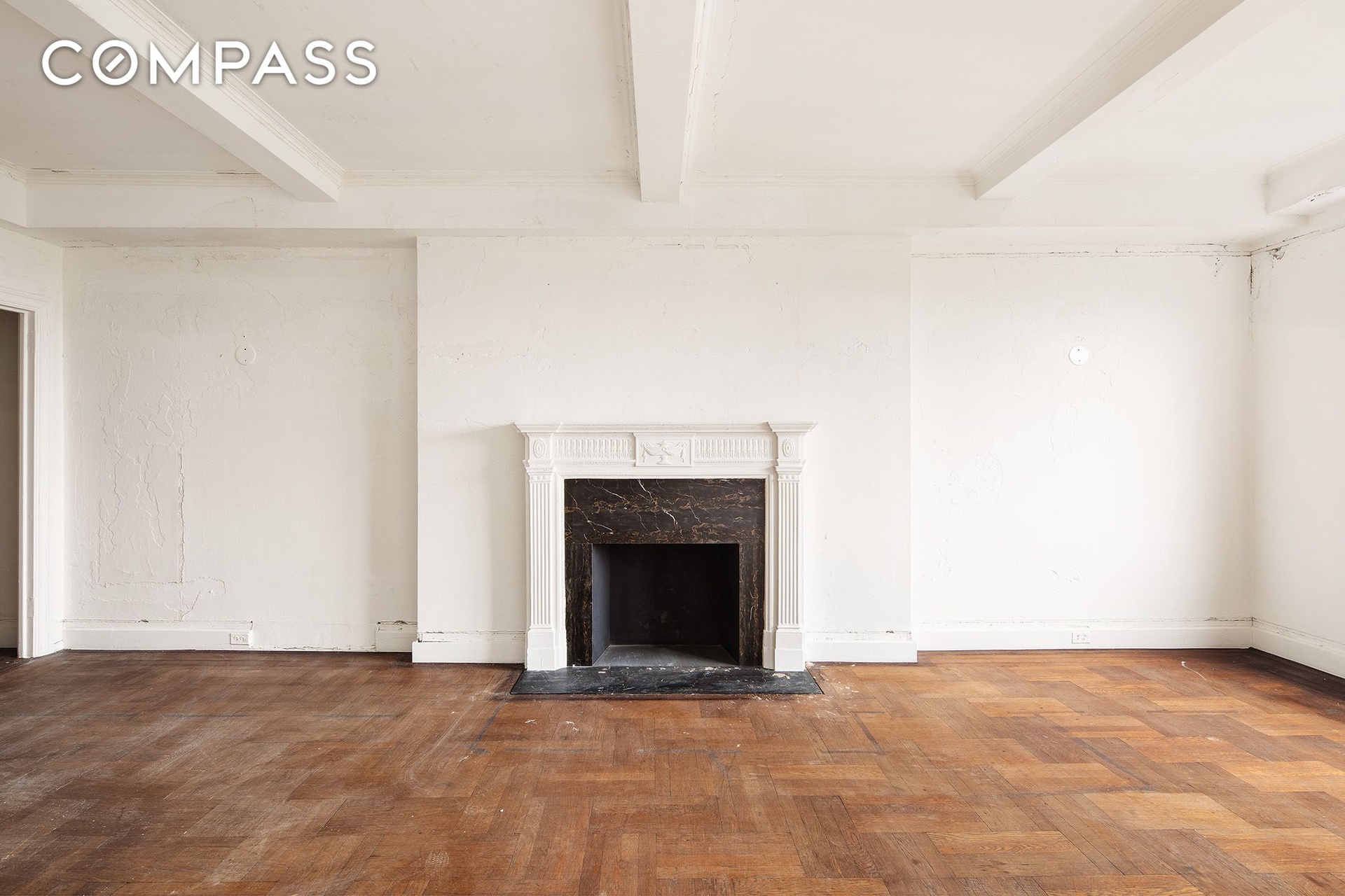 A spacious entry foyer with a large coat closet sets the tone, leading into a grand, sun-drenched living room anchored by a wood-burning fireplace, a timeless and rare feature. Expansive north-facing windows frame panoramic views of Central Park, well above the treetops, offering sweeping vistas from Central Park West to Fifth Avenue, and up to Central Park North.