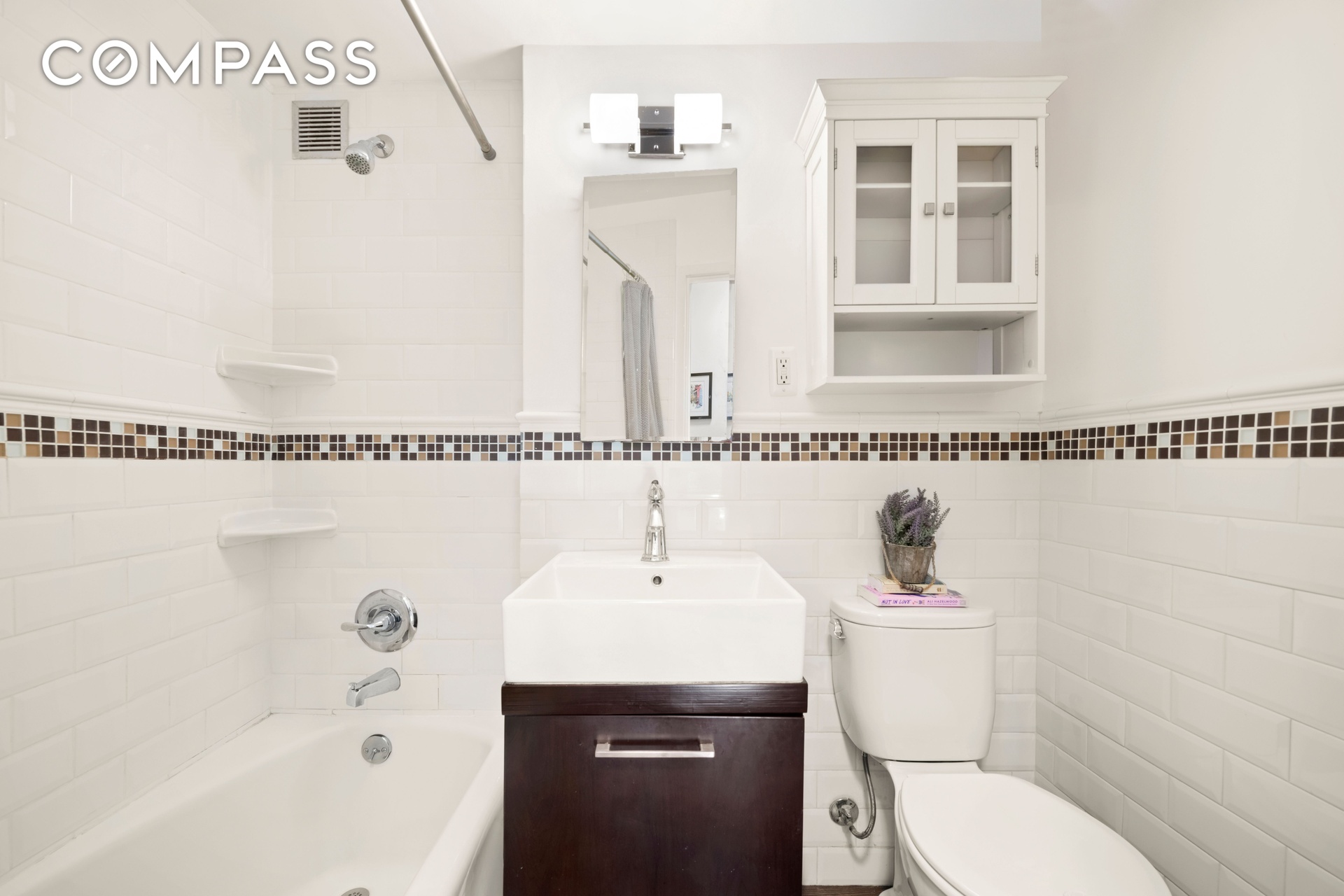Across the hall, the updated bathroom boasts modern lighting, a sleek medicine cabinet, and a shower/bath combo with elegant white tile and a mosaic backsplash.