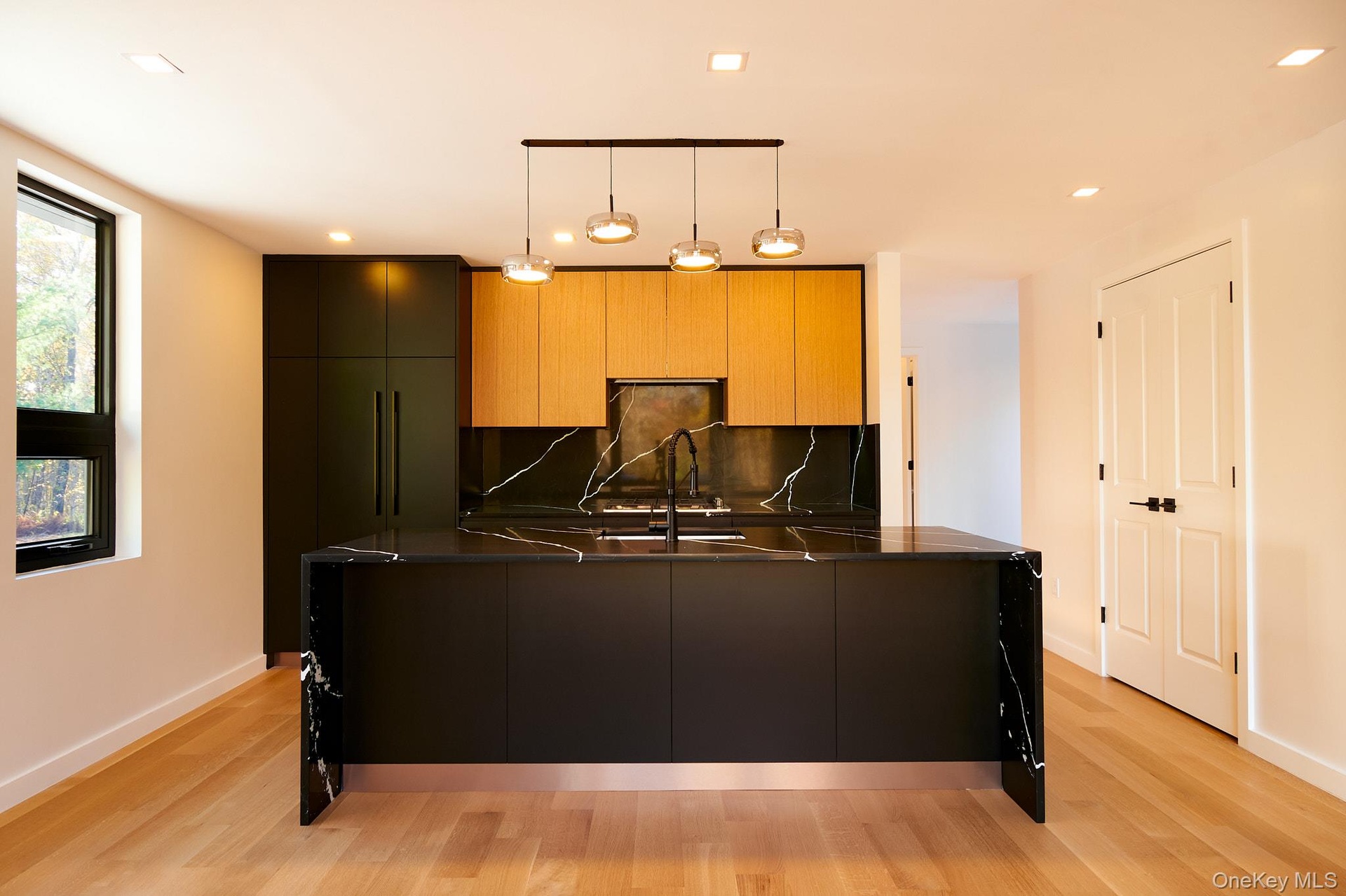 - Kitchen with modern cabinets, pendant lighting, recessed lighting, a large island, and light wood-style floors
