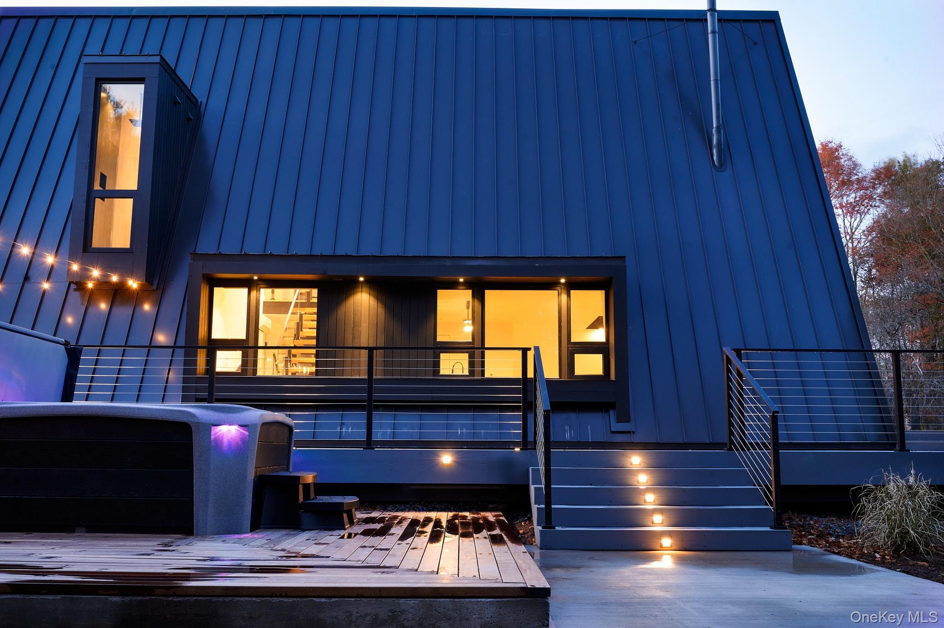 - Back of property featuring a metal roof, a standing seam roof, and a deck