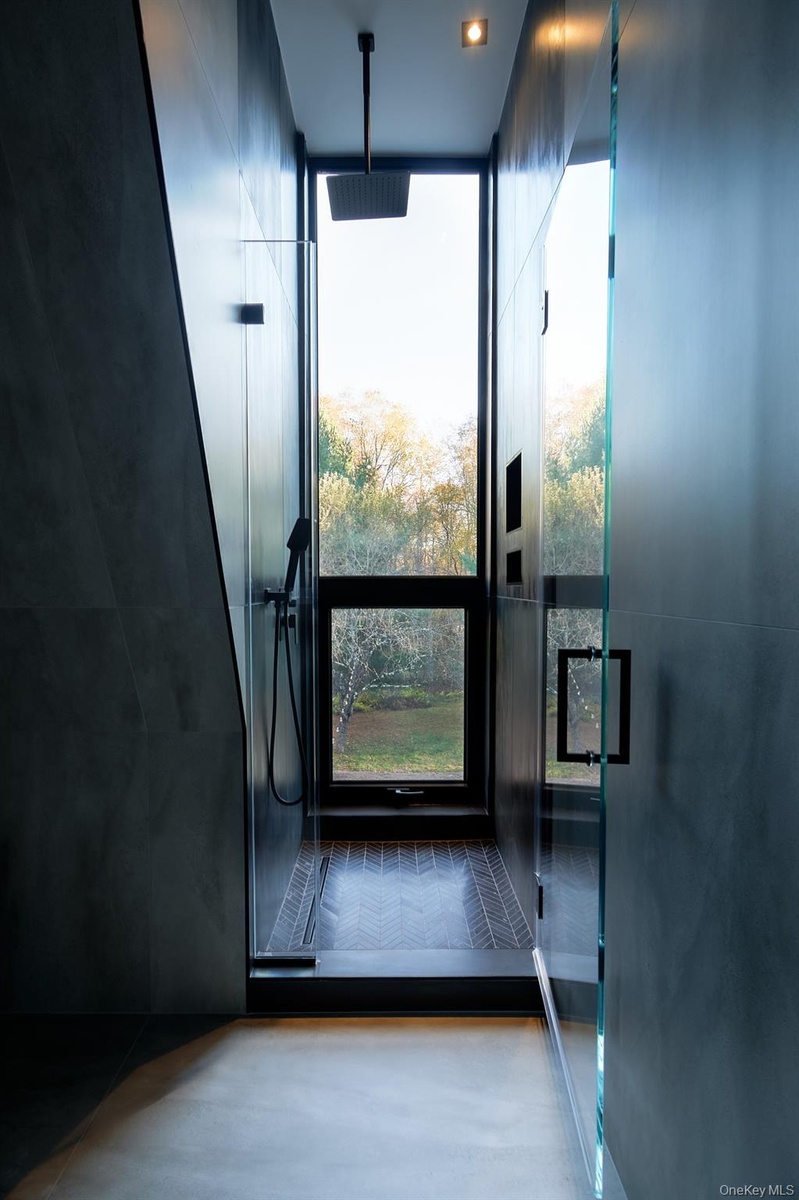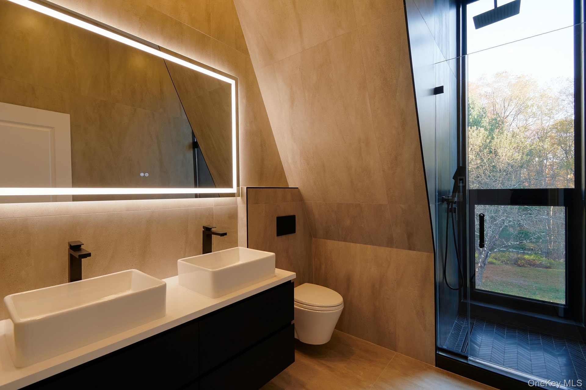 Convenient First Floor bedroom with a walk-in closet and bathroom complete with a steam sauna and ChromasteamX light system from Mr. Steam, transforming your daily routine into a spa experience.
