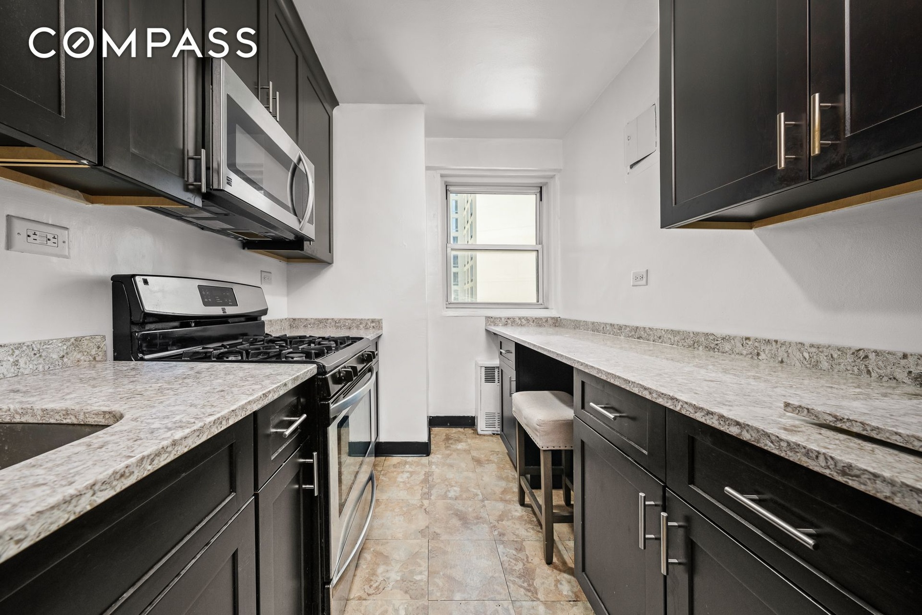 Welcome to this bright and spacious high-floor 1-bedroom co-op located at the intersection of Downtown Brooklyn and Fort Greene. This beautifully maintained home greets you with a generous foyer that can double as a dining nook or home office. The fully renovated windowed kitchen offers ample cabinet and counter space, perfect for storage and meal prep. The expansive living room is ideal for hosting guests or relaxing, while the large bedroom, tucked away for privacy, boasts double exposure and two generous closets. Throughout the unit, you'll find elegant hardwood floors and newly installed double-paned windows, ensuring a peaceful living experience.