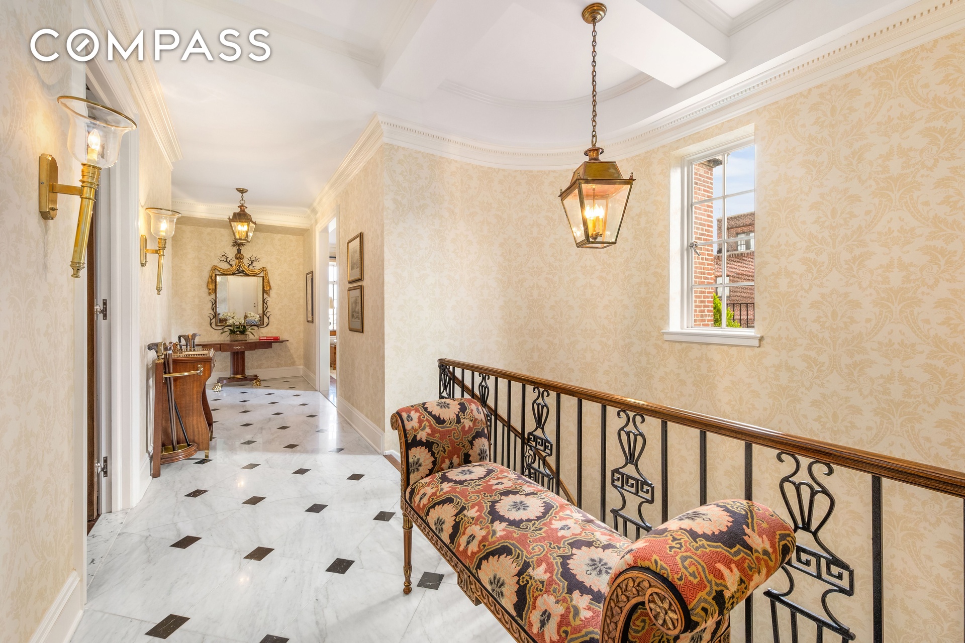 Upon entry from the semi-private elevator landing, an impressive 29-foot entrance gallery leads to spacious, welcoming rooms, perfect for entertaining. The commodious living room, featuring a wood-burning fireplace and breathtaking east and south-facing views of the East River, sets the stage for elegant gatherings. The formal dining room, adorned with floor-to-ceiling French casement doors, offers an exquisite setting for hosting guests. The paneled library, with a second wood-burning fireplace, is a warm and comfortable retreat. The chef's kitchen, appointed with professional-grade appliances and an abundance of space, doubles as a social hub and casual dining area.