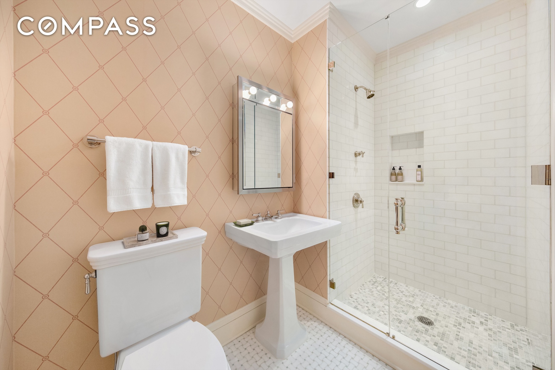 A stately curved staircase with its original wrought iron balustrade leads to the lower level, where the beautifully proportioned corner primary bedroom awaits, offering views of the East River, a spacious en-suite bath, and plenty of closet space. Three additional generously sized bedrooms, two with en-suite baths and one with an adjacent hall bathroom, provide comfort and privacy.