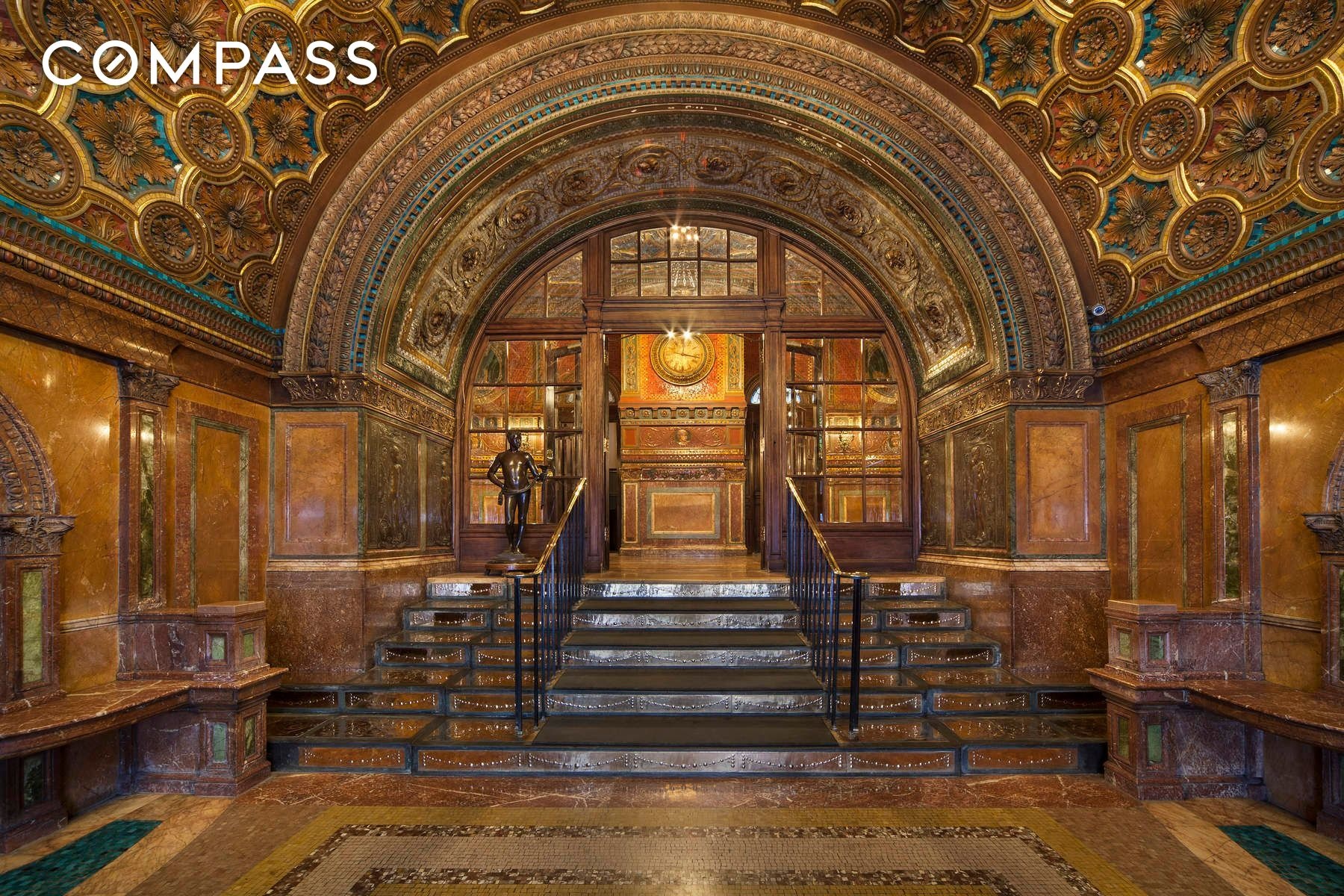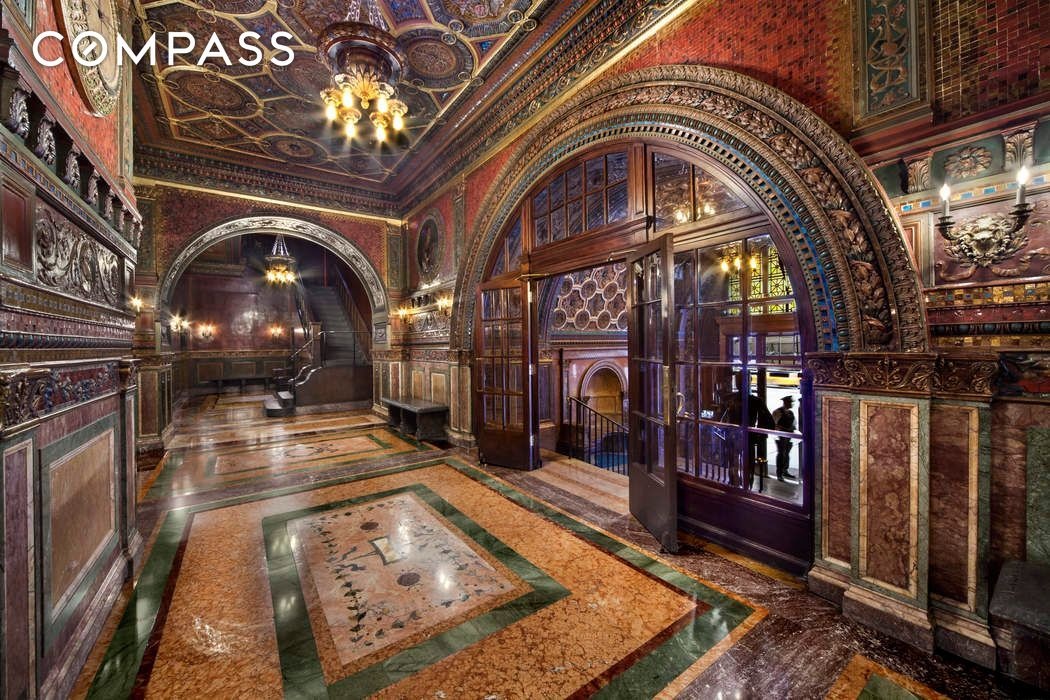 The lobby serves as a testament to late-19th-century extravagance. The floors are a mix of small mosaic tiles and slabs of varicolored Italian marble. Complementary marble was used for the wainscoting and carved marble recesses with benches. Dancing nudes and intricately decorated archways take the eye to a ceiling done in rich hues of red, blue and gold leaf. Stepping inside one is instantly thrust back a hundred years in time the convenience of a full-time doorman, elevator, laundry facilities, gym, bike room and a common roof deck with Central Park views.