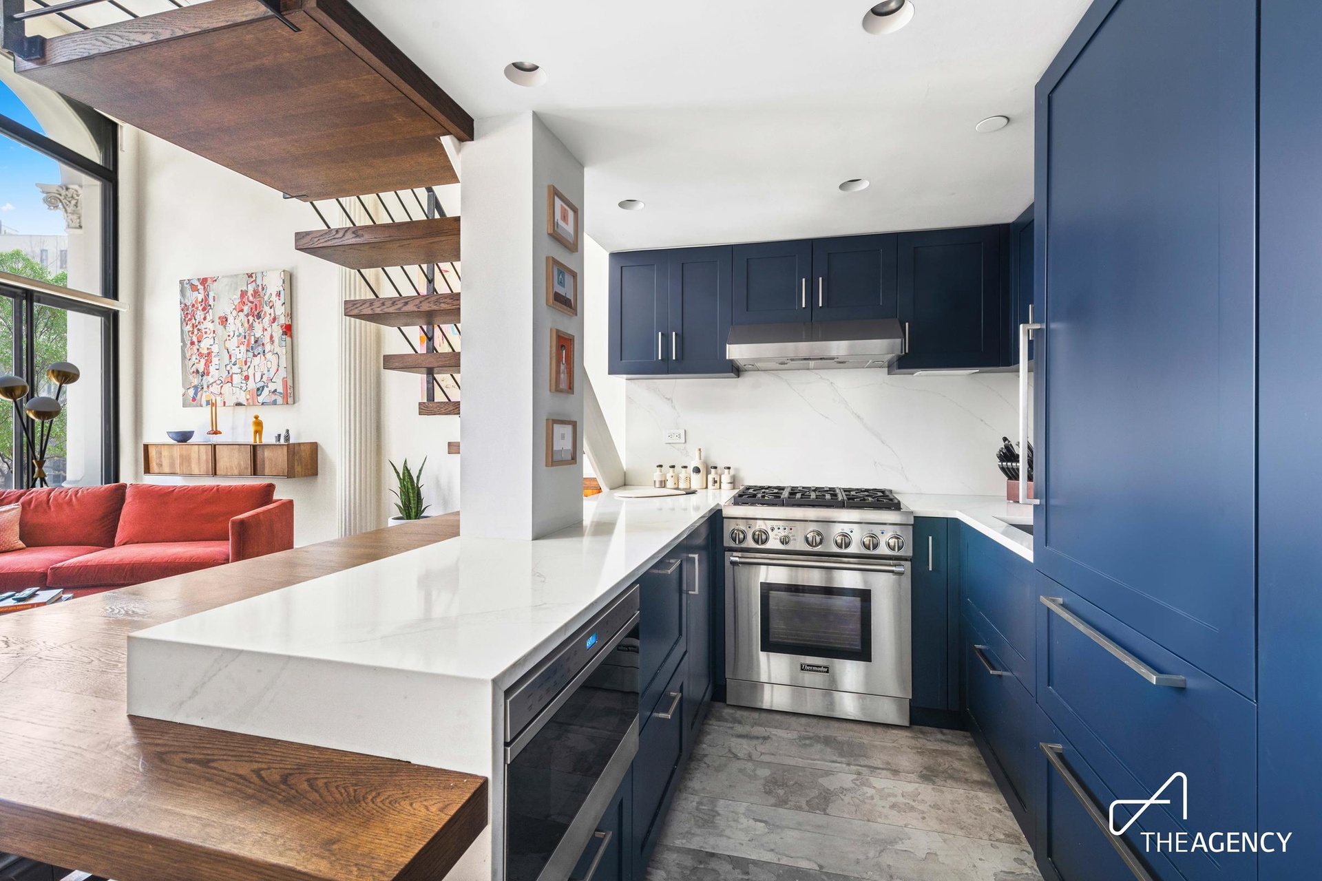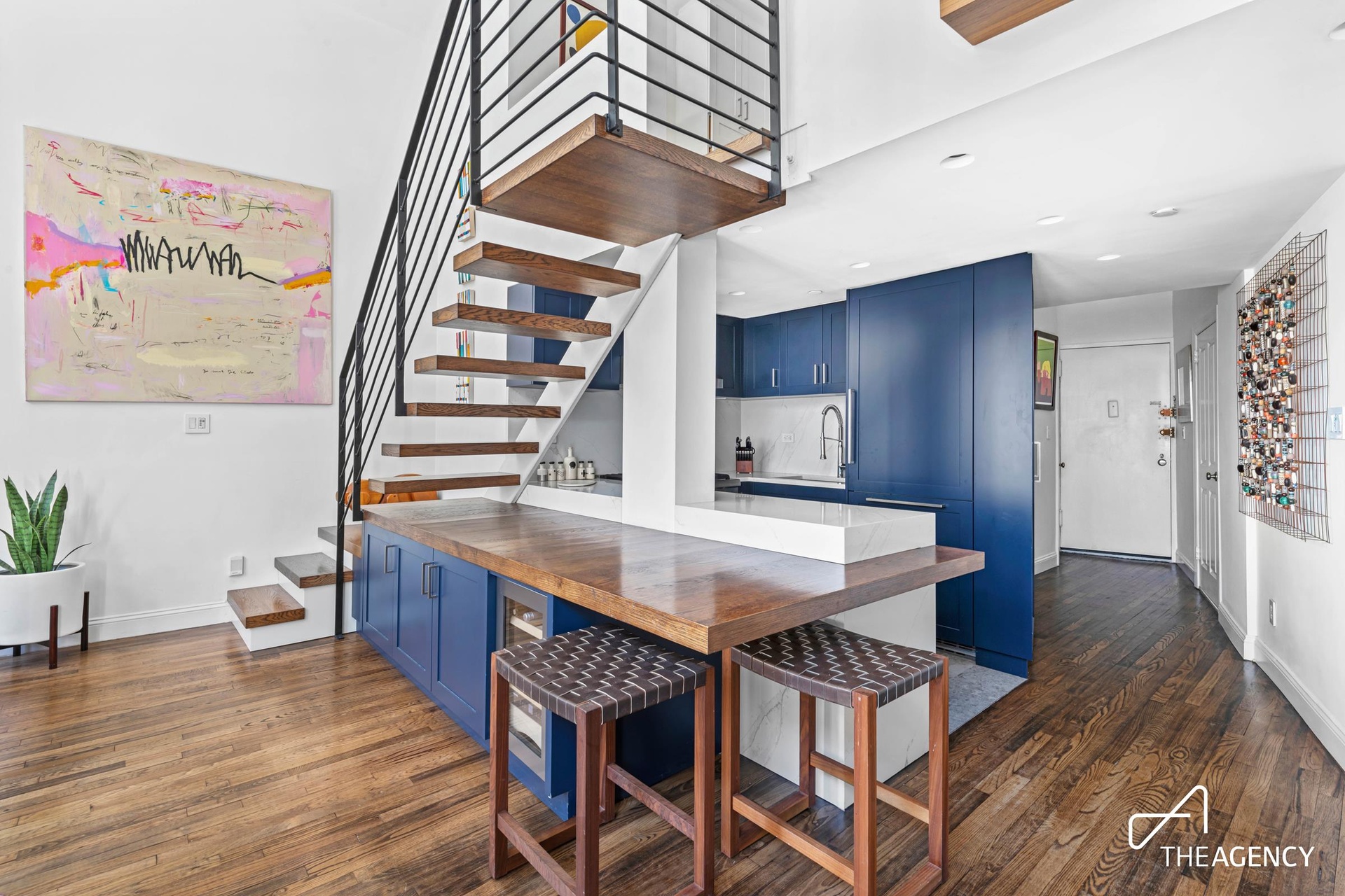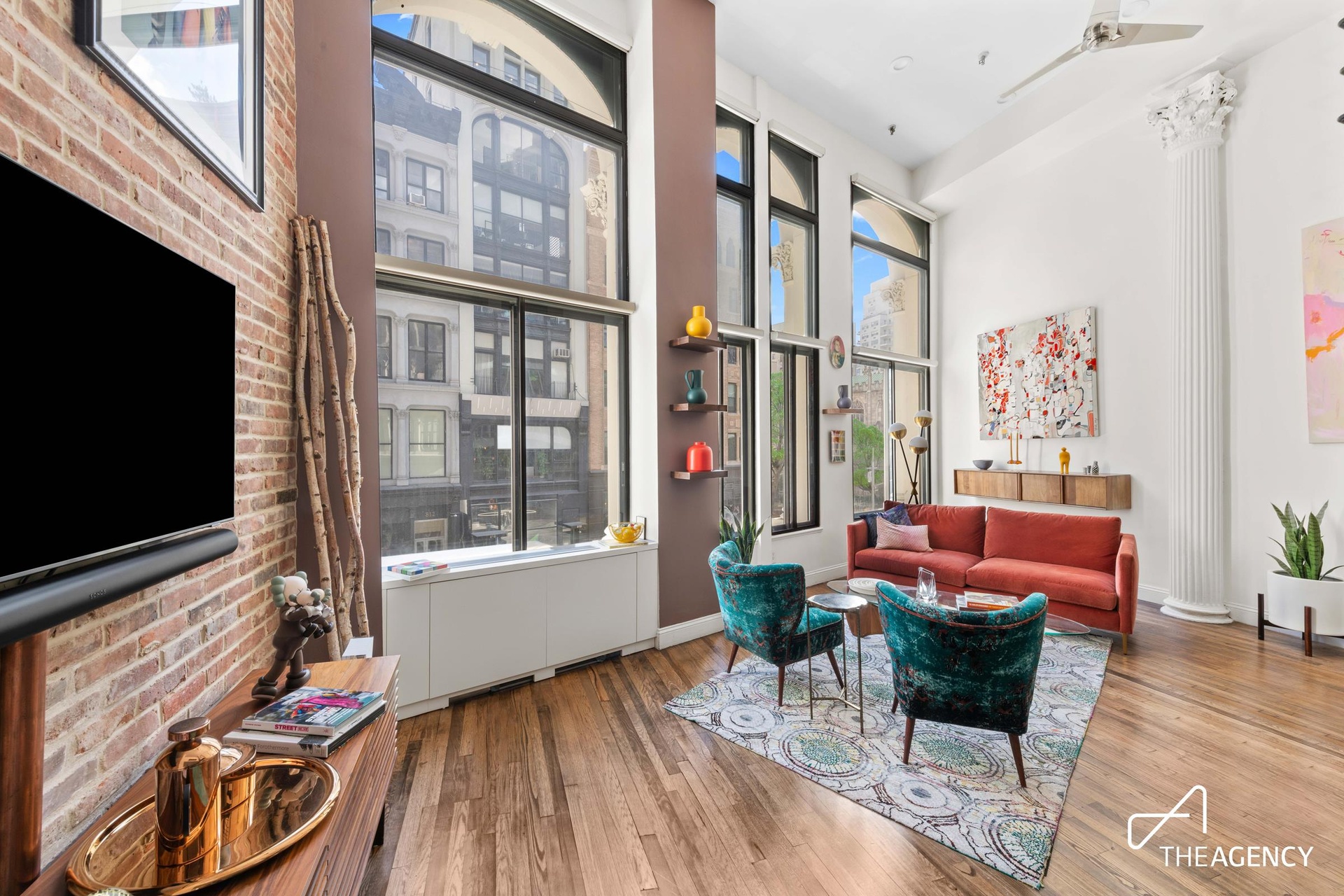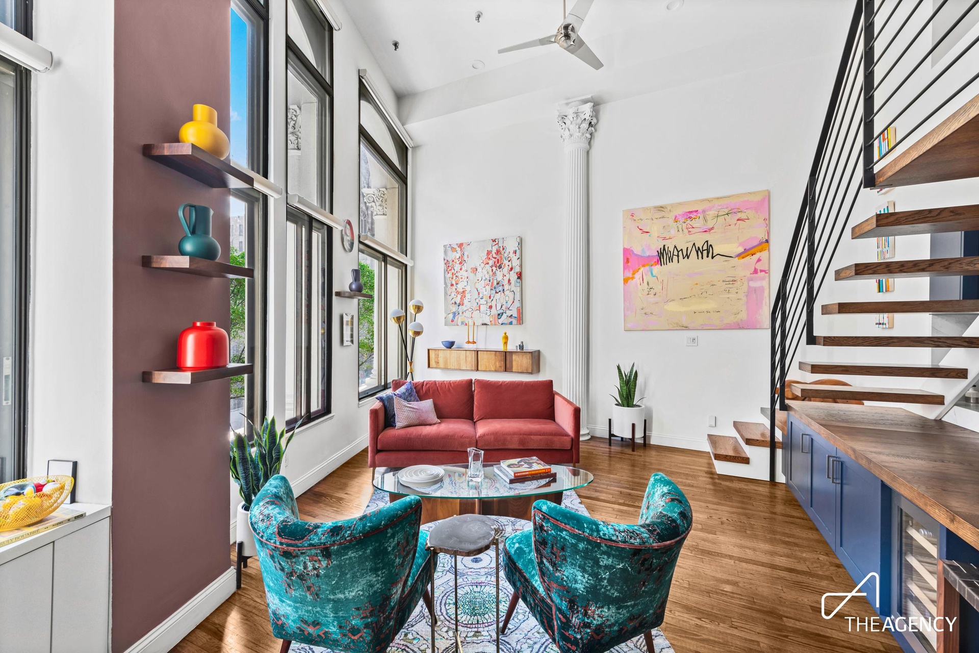 Upon entry, you’re greeted by exposed brick, massive east-facing windows, a striking original Corinthian column, and an elegant floating staircase—all combining to create a sophisticated yet inviting ambiance.