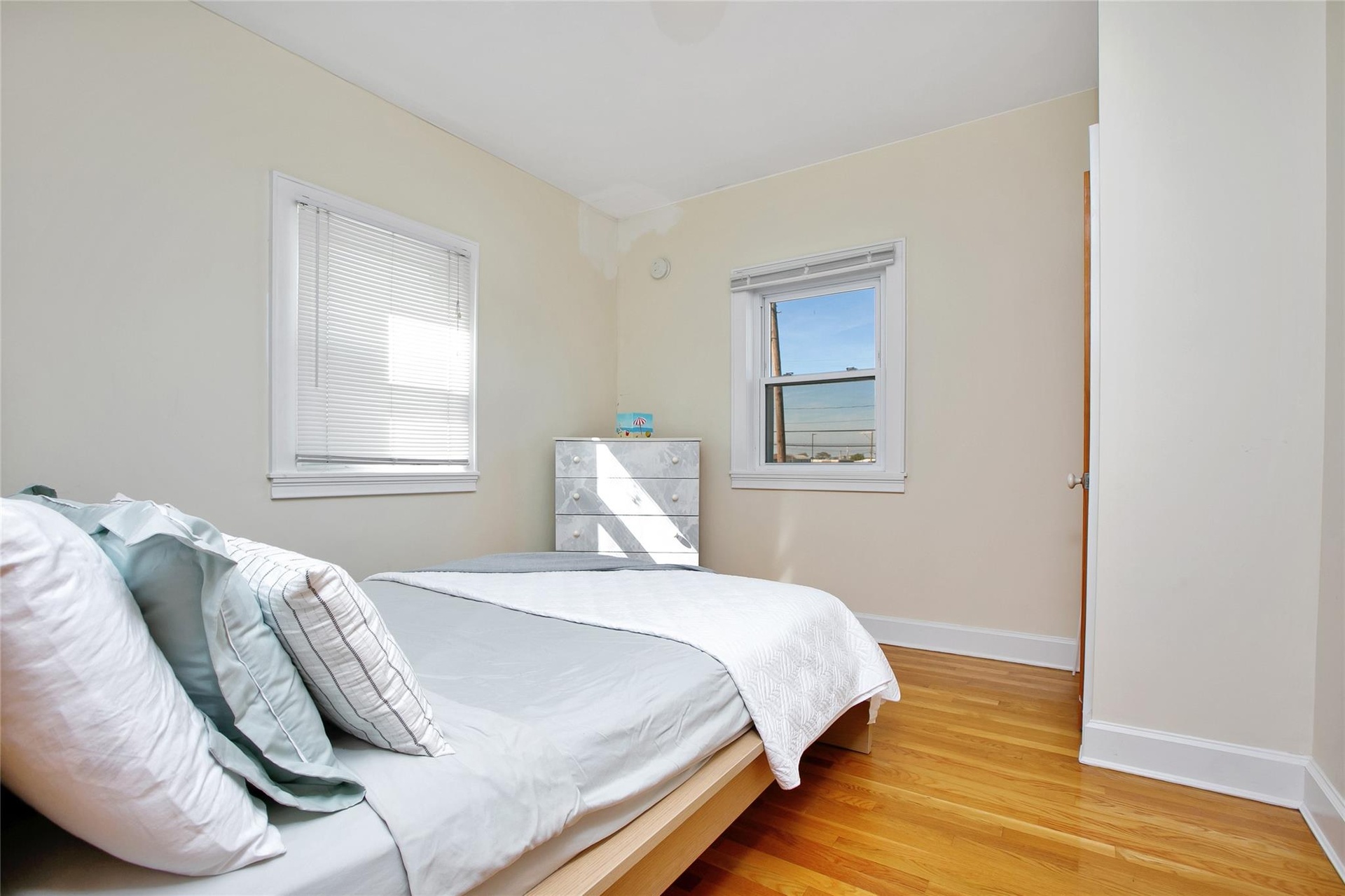 - Bedroom with hardwood / wood-style floors and multiple windows