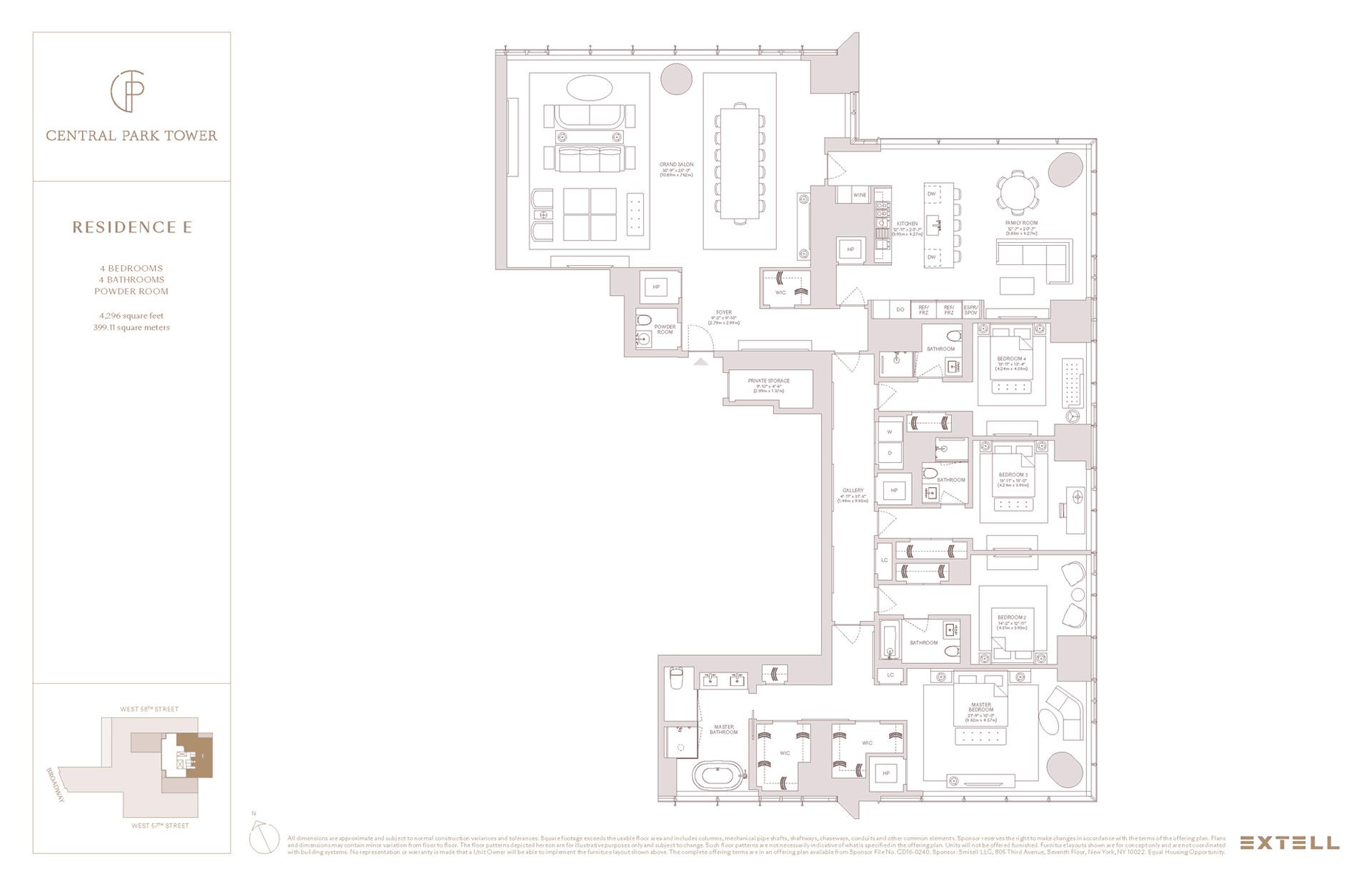 Perched 1,000 feet above New York City, this stunning 4 bedroom, 4.5 bath, half-floor residence at Central Park Tower boasts 4,295 square feet of ultra luxury living space AND THE HIGHEST CEILING OF ANY UNIT. The soaring 13'6 ceilings, coupled with a state of the art sound proof glass curtain wall spanning the entire residence, provides a glorious open and airy living environment. A formal entry foyer and gallery lead to an expansive great room offering sweeping north direct park and river panoramas. A spectacular corner gourmet eat-in windowed kitchen/family room features stone slab counters with an under-mount sink, Miele fully integrated appliances including a built-in coffee/espresso system and custom cabinetry by Smallbone of Devizes.