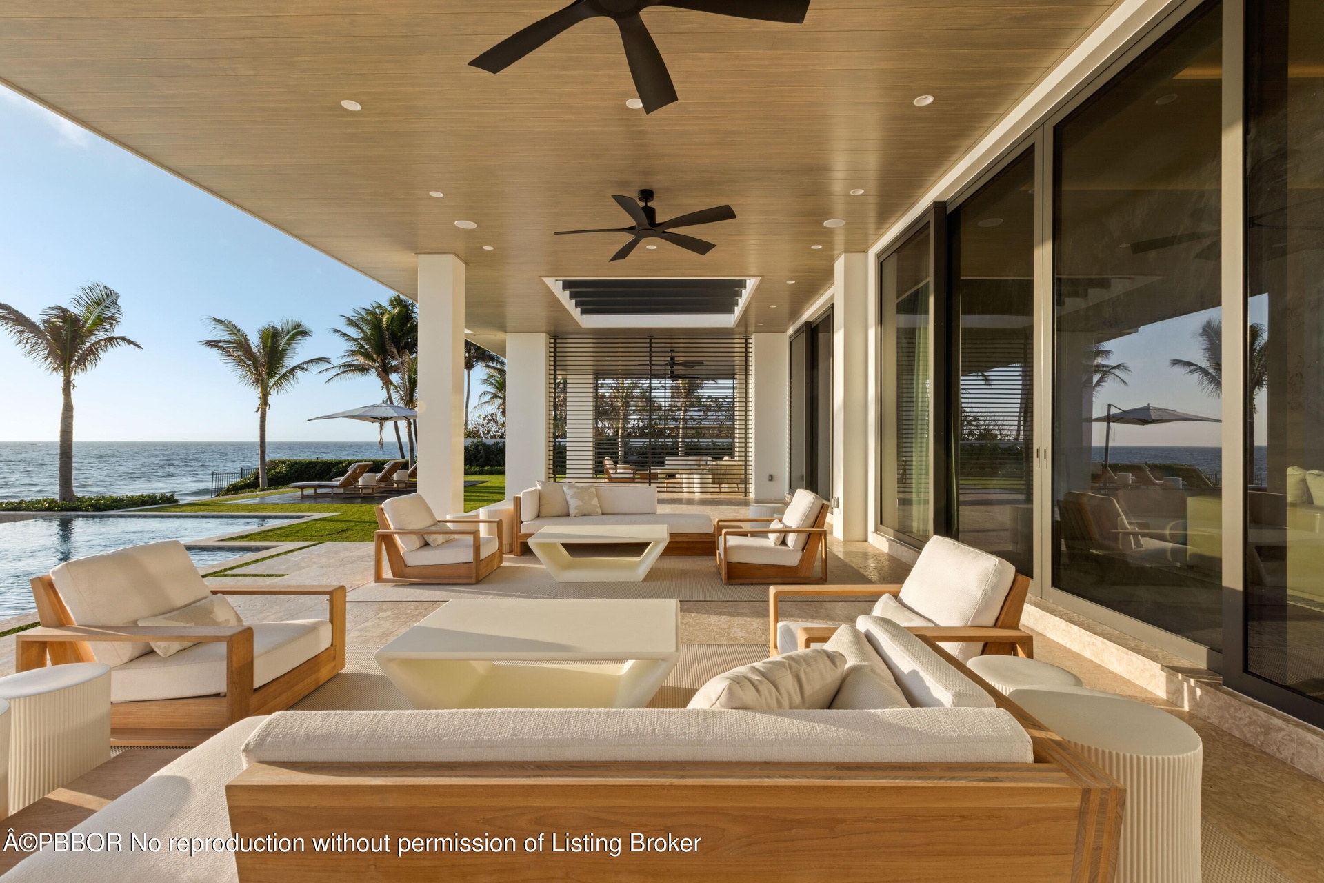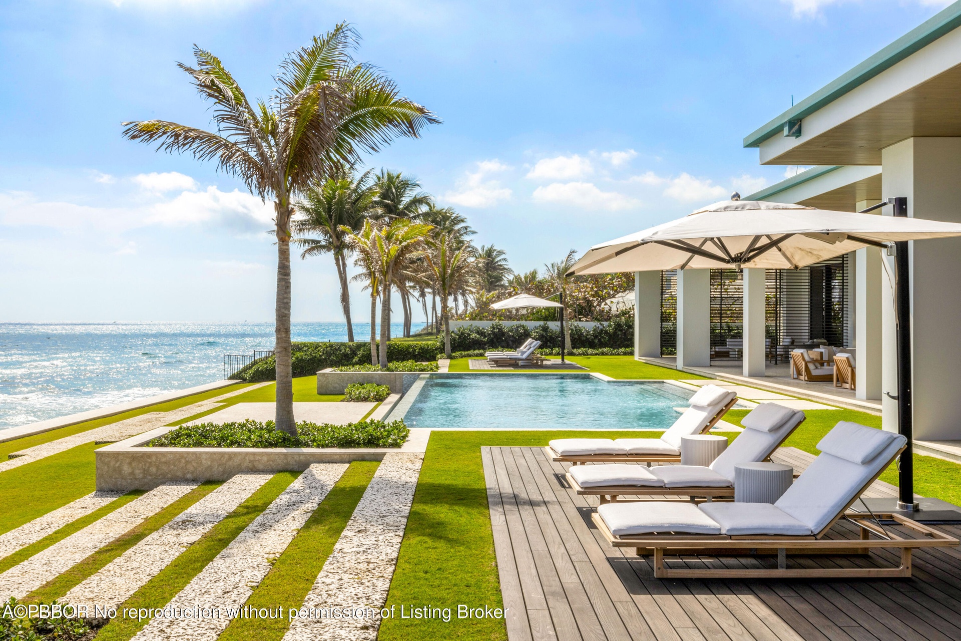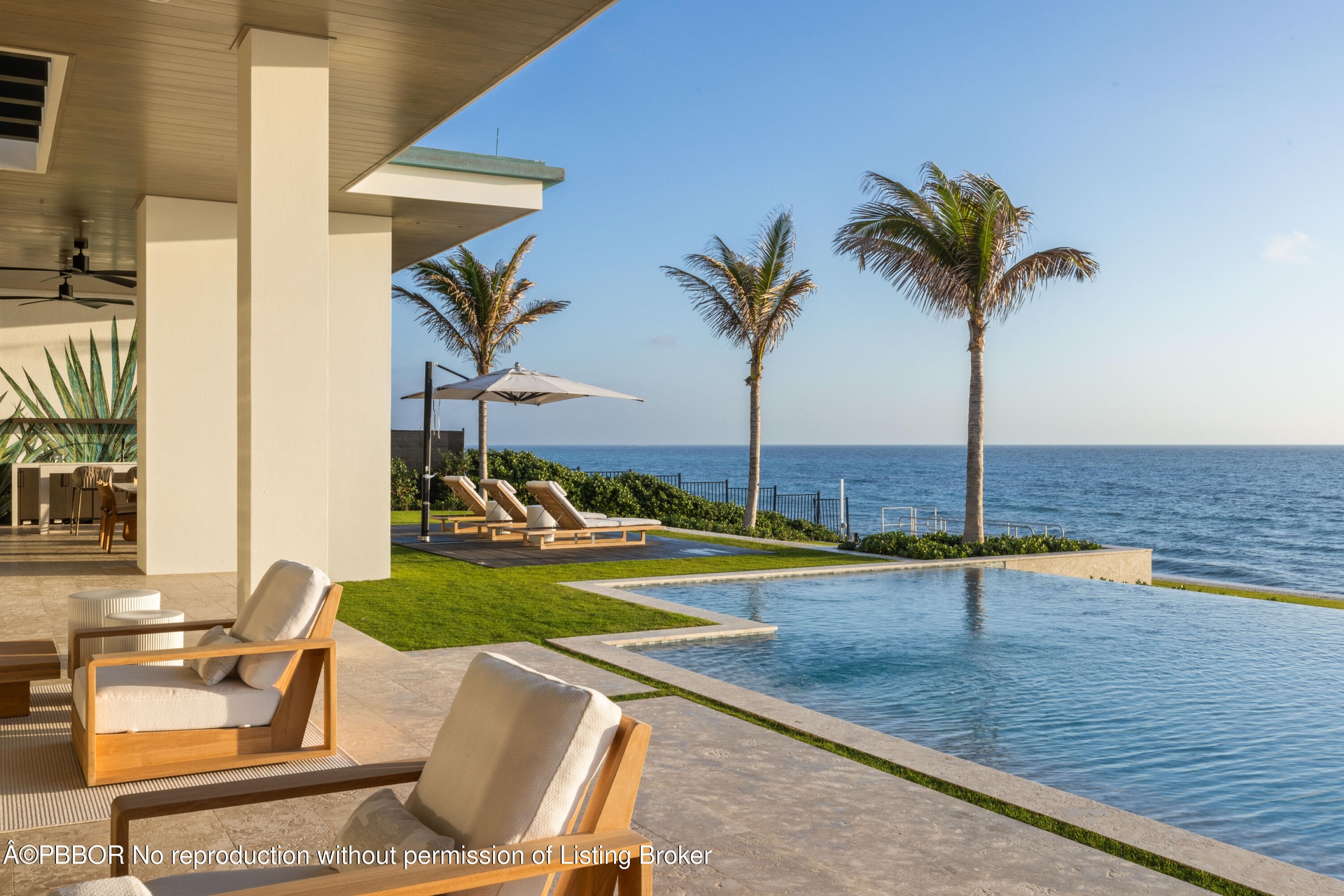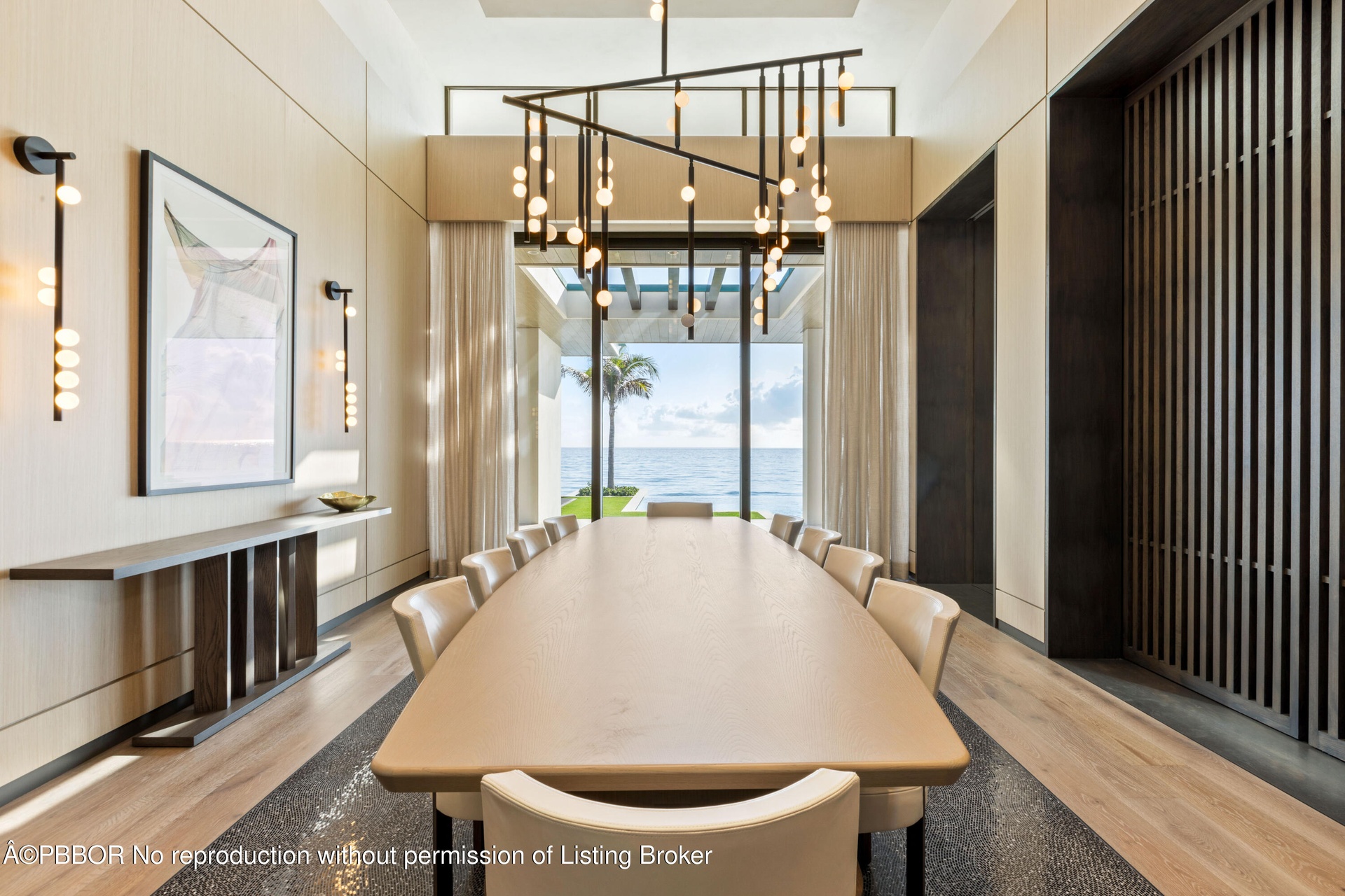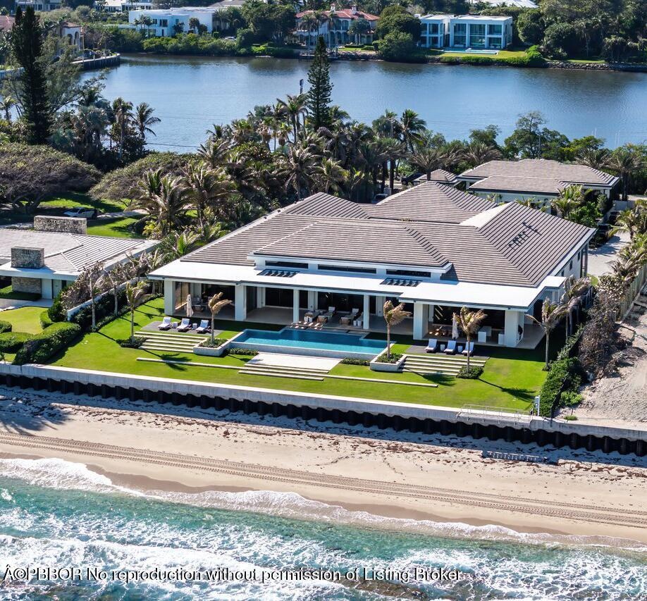 Set between the Atlantic Ocean and Intracoastal Waterway, 1160 S. Ocean Blvd is a rare retreat where architecture and nature exist in perfect harmony. Spanning 27,745± square feet under roof on nearly 2 acres, this newly completed estate offers 160 feet of direct ocean frontage and private Intracoastal access, creating an unrivaled connection to land and sea. Designed with balance and thoughtful craftsmanship, the 25,197± square-foot main house flows effortlessly from one space to the next. From the grand entry hall, the journey unfolds—a symphony of light and space, where the living room merges with the ocean beyond. The formal dining room, with its ocean-facing bar, sets the stage for elegant entertaining, while the open-concept kitchen and family area form the heart of the home. A private catering kitchen allows staff to work discreetly behind the scenes. The primary suite, occupying its own wing, features a private sitting room, ocean-view office, and dual dressing rooms. The spa-like primary bath, wrapped in Calacatta marble, offers a stone soaking tub and dual water closets. Three additional guest suites on the main level each provide private en-suite baths and walk-in closets. On the lower level, the home transforms into a haven of leisure and wellness, featuring a state-of-the-art gym, steam shower, wine room, game room, and immersive theater. Two additional bedrooms offer private accommodations for staff or extended family. From concept to completion, this home was orchestrated by female builder Siobhan Zerilla, principal of Bluedoor Building, bringing vision and artistry to every detail. For the automotive enthusiast, a climate-controlled 13-car garage provides the perfect space for a prized collection. A separate guest house offers two bedrooms, two full baths, a half bath, a full kitchen, dining area, and private laundry, while its own cabana and private pool create a secluded retreat. The outdoor spaces are equally intentional, with a covered courtyard and east-facing loggia, designed for meditation, relaxation, and celebration. A private dock, equipped with two boat lifts, allows effortless Intracoastal access for yacht owners and water enthusiasts. Every surface, every detail has been curated for those who expect the best. White oak wood floors add warmth, complemented by Santorini Shell Stone, which transitions from indoor elegance to outdoor serenity. The home's refined palette is completed with Calacatta Gold, Black Alexander Honed stone, bespoke plaster walls, mahogany, and white oak accents. This is more than a home it is a journey, a sanctuary where every detail whispers serenity. 1160 S. Ocean Blvd, Manalapan where life finds its rhythm.