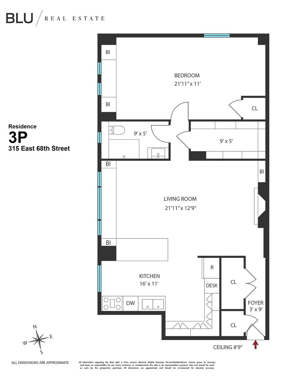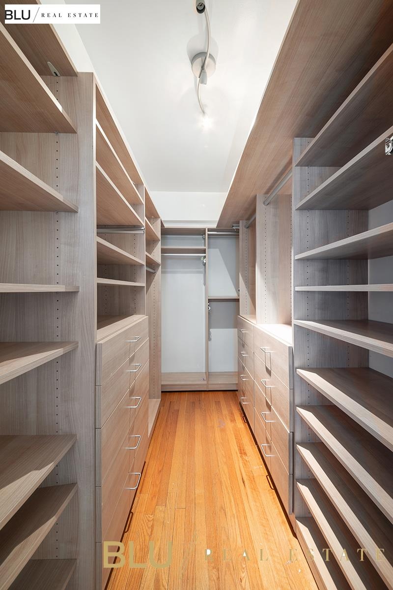 You enter into the apartment through the formal entry foyer, which is lined with closets. It then seamlessly flows from the living room to the open kitchen with an oversized breakfast bar, making for seamless entertaining. The windowed kitchen with sleek stainless-steel appliances, stone countertops and a built-in desk nook to keep things in order. The windowed bathroom is renovated with a glass walk-in shower. There is an oversized custom walk-in closet adjacent to the king-sized 21’ long bedroom, that is large enough to be configured for additional functionality.