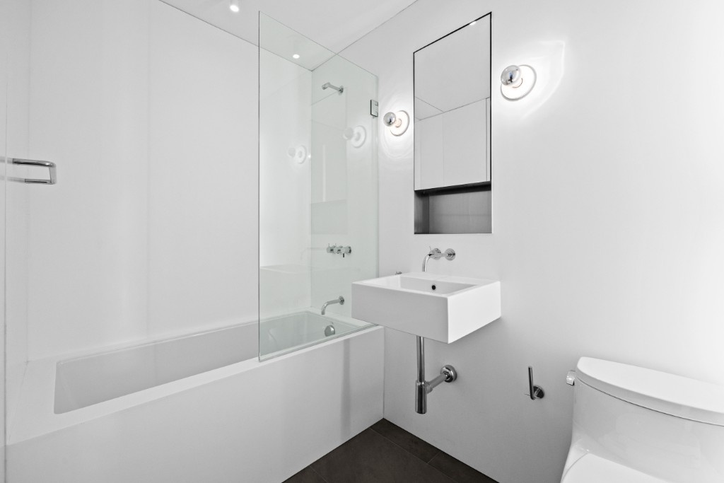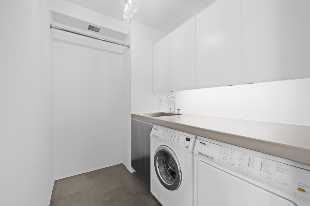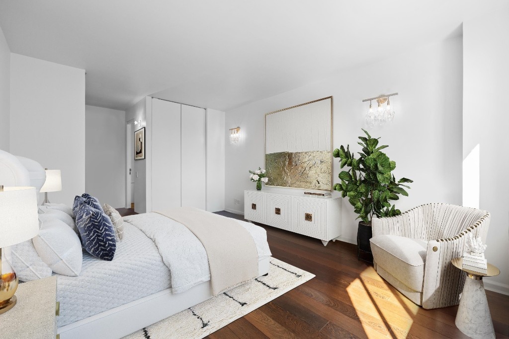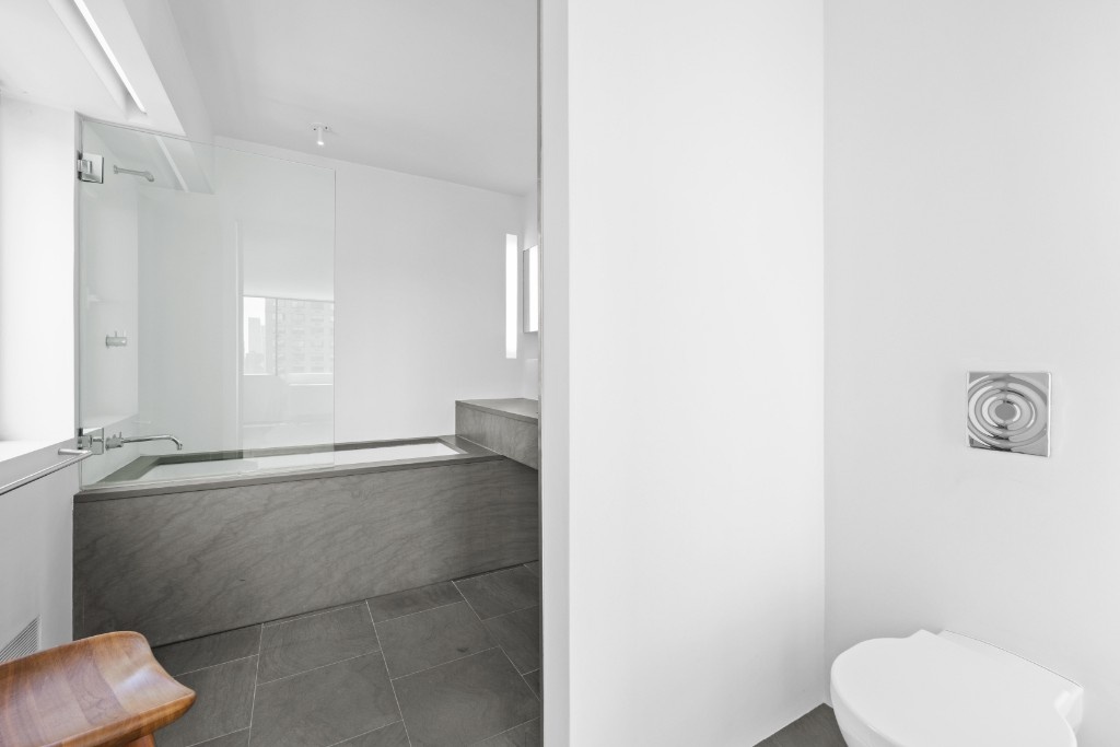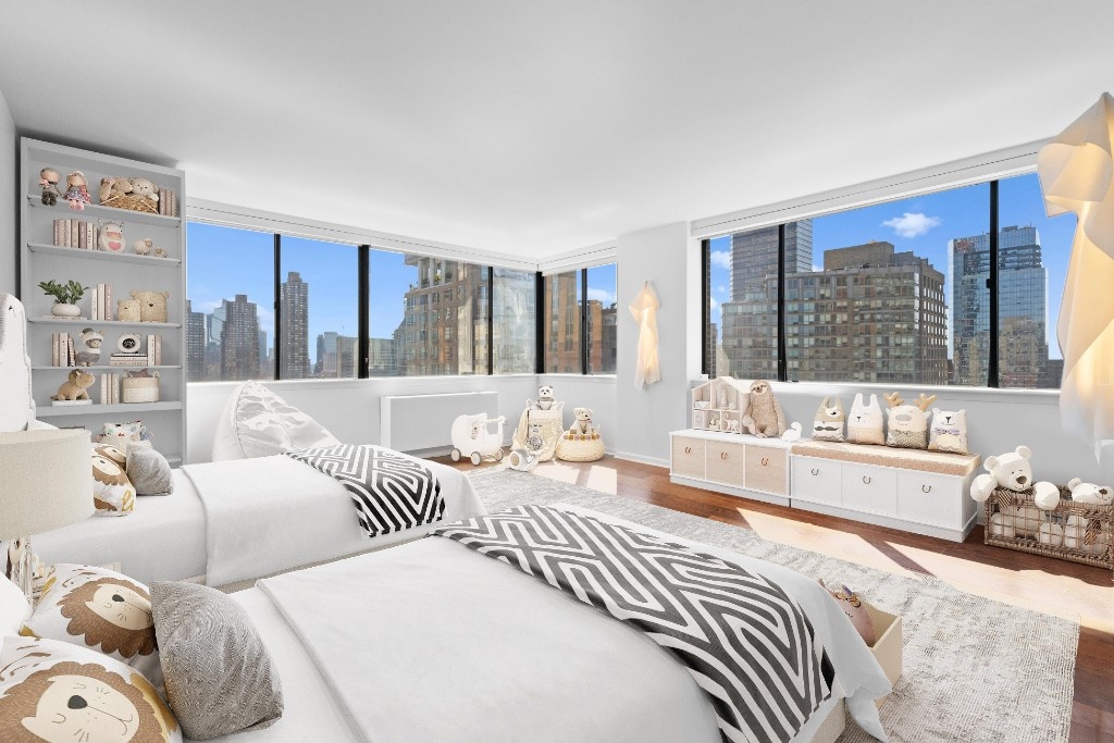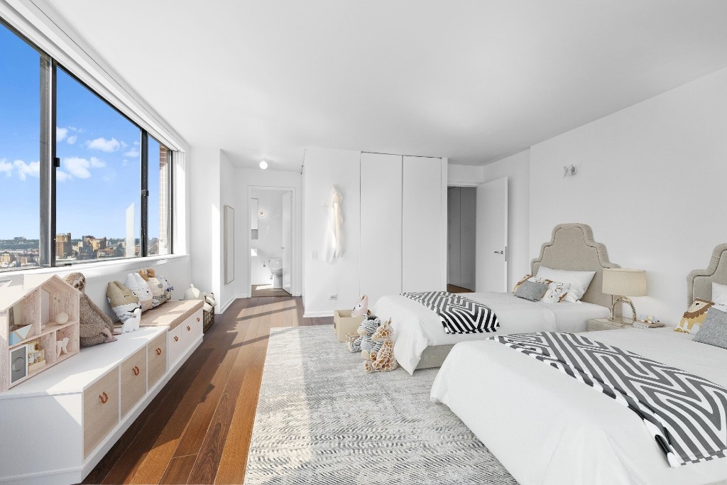The impressive primary bedroom, measuring 27 by 18 feet, offers spectacular southern and western views over Lincoln Center. This luxurious suite features a built-in home office and a spacious walk-in dressing area. On the 28th floor, a larger bedroom measuring 16 by 19 feet awaits, with two exposures, walls of windows, an en-suite bathroom, and ample closet space. Another luminous bedroom on this floor faces south, offering expansive Lincoln Center views, an en-suite bathroom, and additional closets. The privacy of the 28th-floor bedrooms is enhanced by a dedicated access door. All full bathrooms feature sleek, modern finishes of the highest quality, including Zuma soaking tubs, Toto, Duravit, and Vola fixtures.