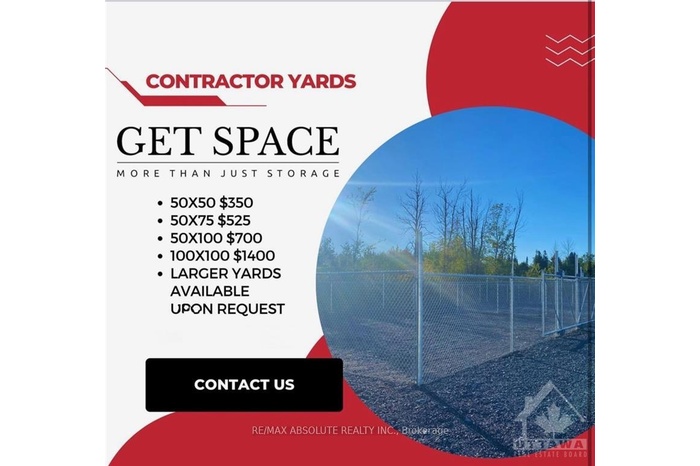 DescriptionIndustrial vacant land is available for lease, with options ranging from 0.5 acres to 8.4 acres on a gravel and graded lot. Located just minutes from Cornwall and a short commute to Ottawa, the property offers excellent access to HWY 138, HWY 401, and HWY 417. The facility includes a gravel pad base and access to hydro. There is also an option to fence part or all of the area. Unfenced rates is $2,000 per acre or the option to have it fully fenced, the rate is $3,000 per acre, which includes a 17-foot rolling gate and barbed wire. Lease rates are dependent on the size of the space and are subject to HST. Another option would be a private fenced contractor yard starting at $350 (50ft x 50ft) or bigger.Amenities- Unknown