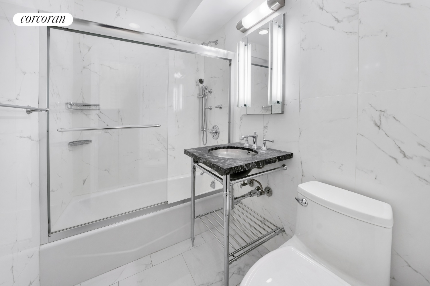 The corner primary bedroom is a serene retreat with two exposures, offering ample space for a king-size bed, a desk, and additional furnishings. It also features a generous closet and a windowed en-suite bathroom with a custom shower. The second bedroom is bright and spacious, perfect for guests, a home office, or a nursery. Both bathrooms are finished with marble tile, Porcelanosa countertops, and Kohler fixtures, adding a touch of luxury throughout. Each room is equipped with through-the-wall air conditioning for year-round comfort.