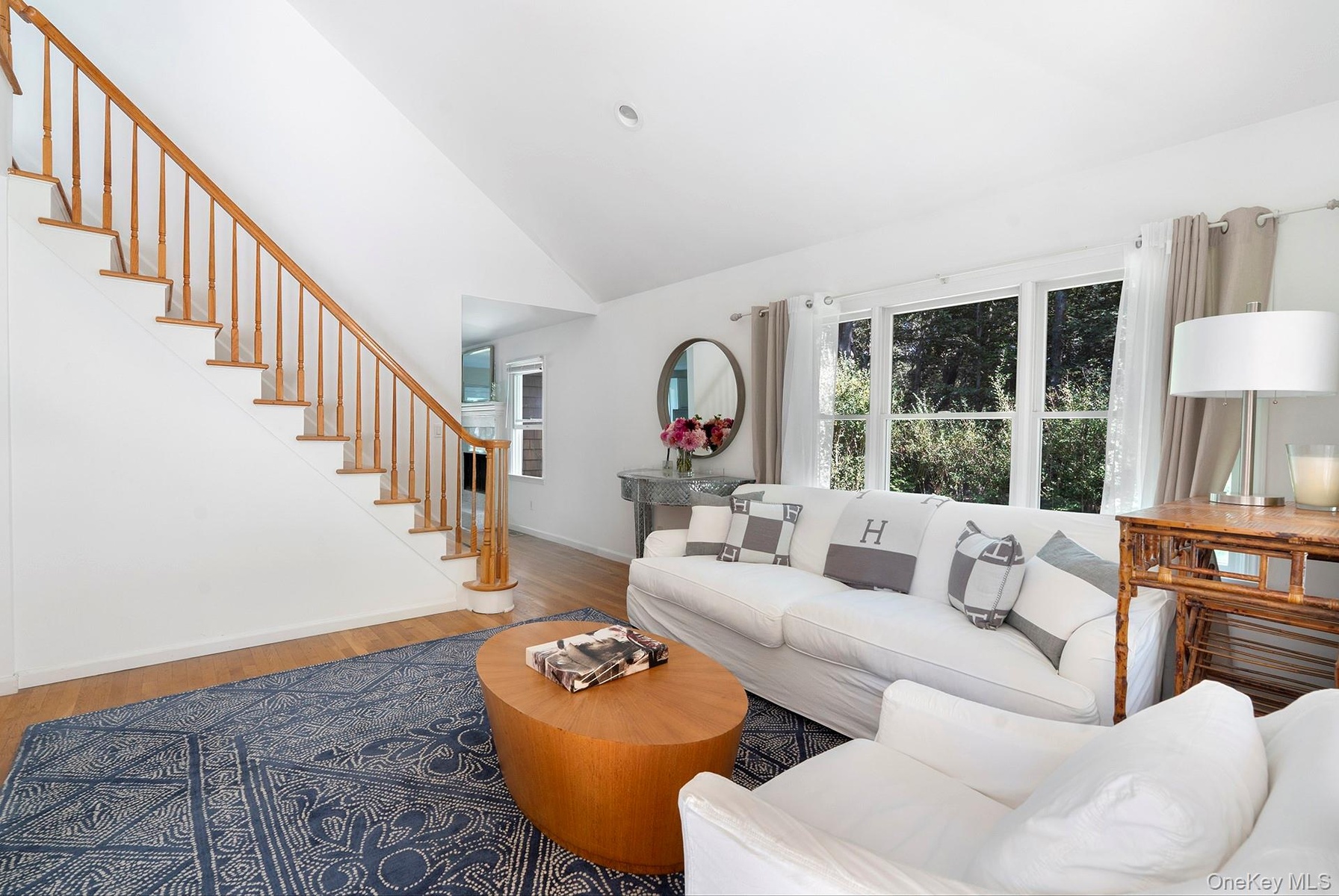 - Living area with high vaulted ceiling and wood finished floors