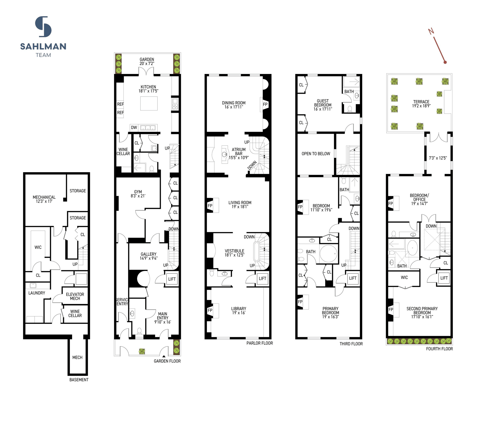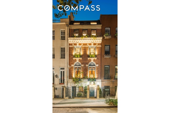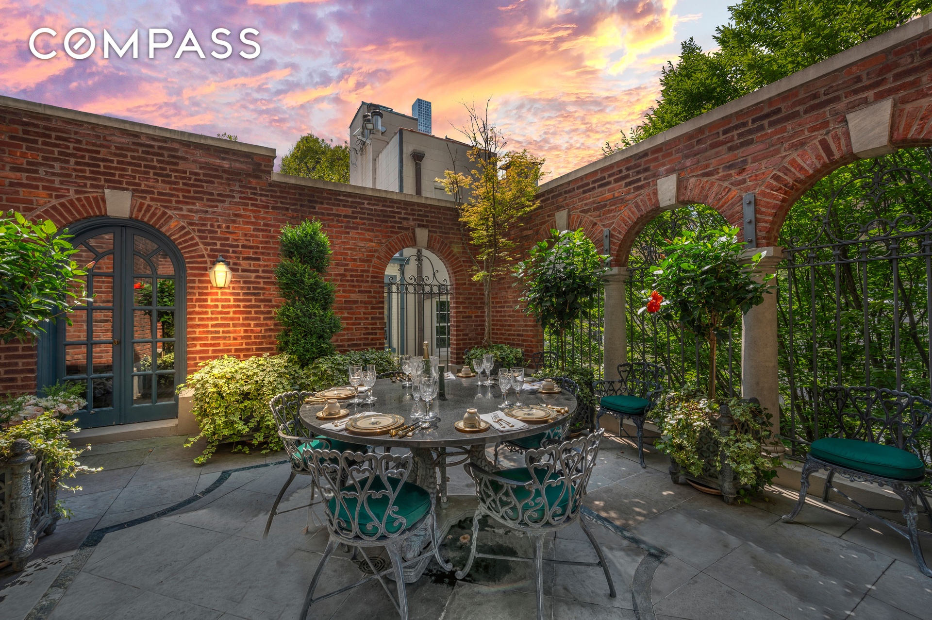 Ascend the grand staircase or take the elevator to discover the upper floors. The third floor offers three bedrooms, each with an en-suite bathroom and ample closet space. The primary bedroom is located on the fourth floor, providing electronic skylights, a custom sound system, and access to the rooftop terrace—undoubtedly the crown jewel of the home. Spanning 20 feet in width, this elegant sun-drenched terrace has bluestone and marble flooring, a snow-melting system, and a fountain illuminated by lanterns. It’s simply magical.