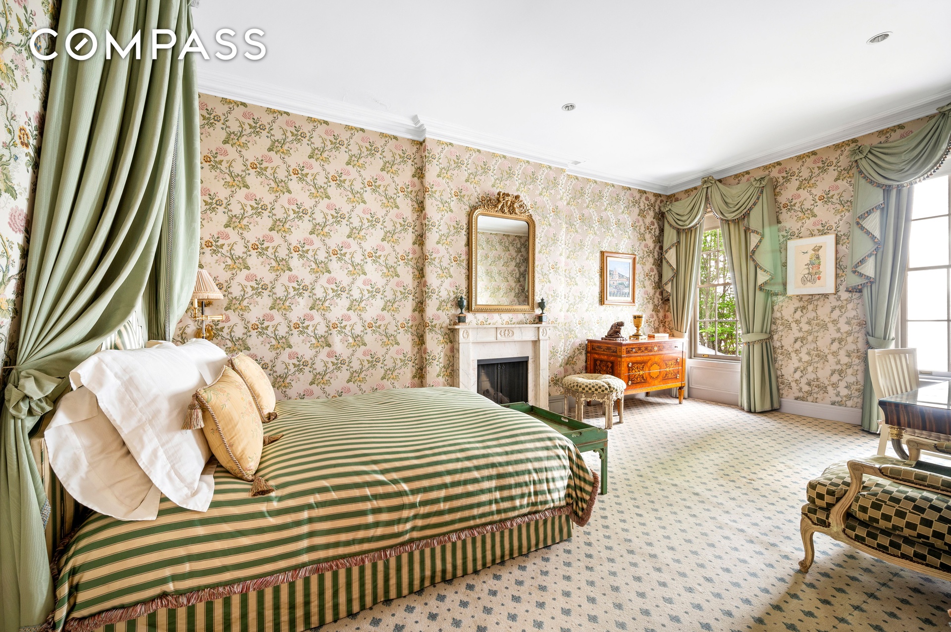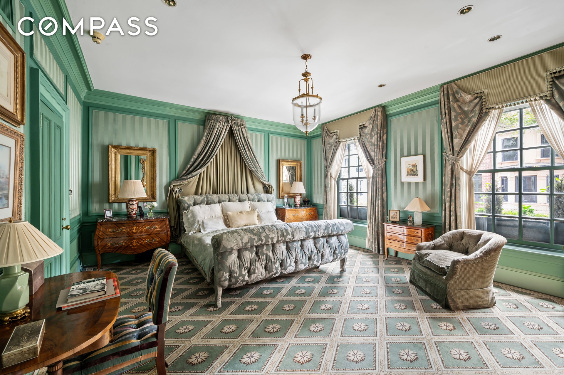 The parlor floor features Versailles wood floors, 13.5-foot ceilings, and a library that retains its original pine wood from 1872, illuminated by a bronze chandelier from the early 1800s. The grand living room features custom faux Fragonards, a grand piano, and a Venetian chandelier. The Belle Epoque American Walnut bar, topped with a Lalique French crystal ceiling, offers an exquisite space to entertain. The dining room, bathed in natural light from large windows, is graced by a Provencal hand painted tapestry from the 1750s, meticulously restored by the Metropolitan Museum. Find a French Country eat-in kitchen, a 300-bottle wine cellar, eight fireplaces, and a grand staircase that weaves through the home, linking all levels.
