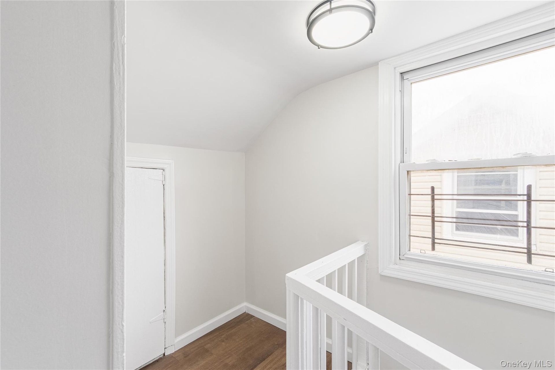 - Hallway featuring an upstairs landing, vaulted ceiling, and dark wood-style floors