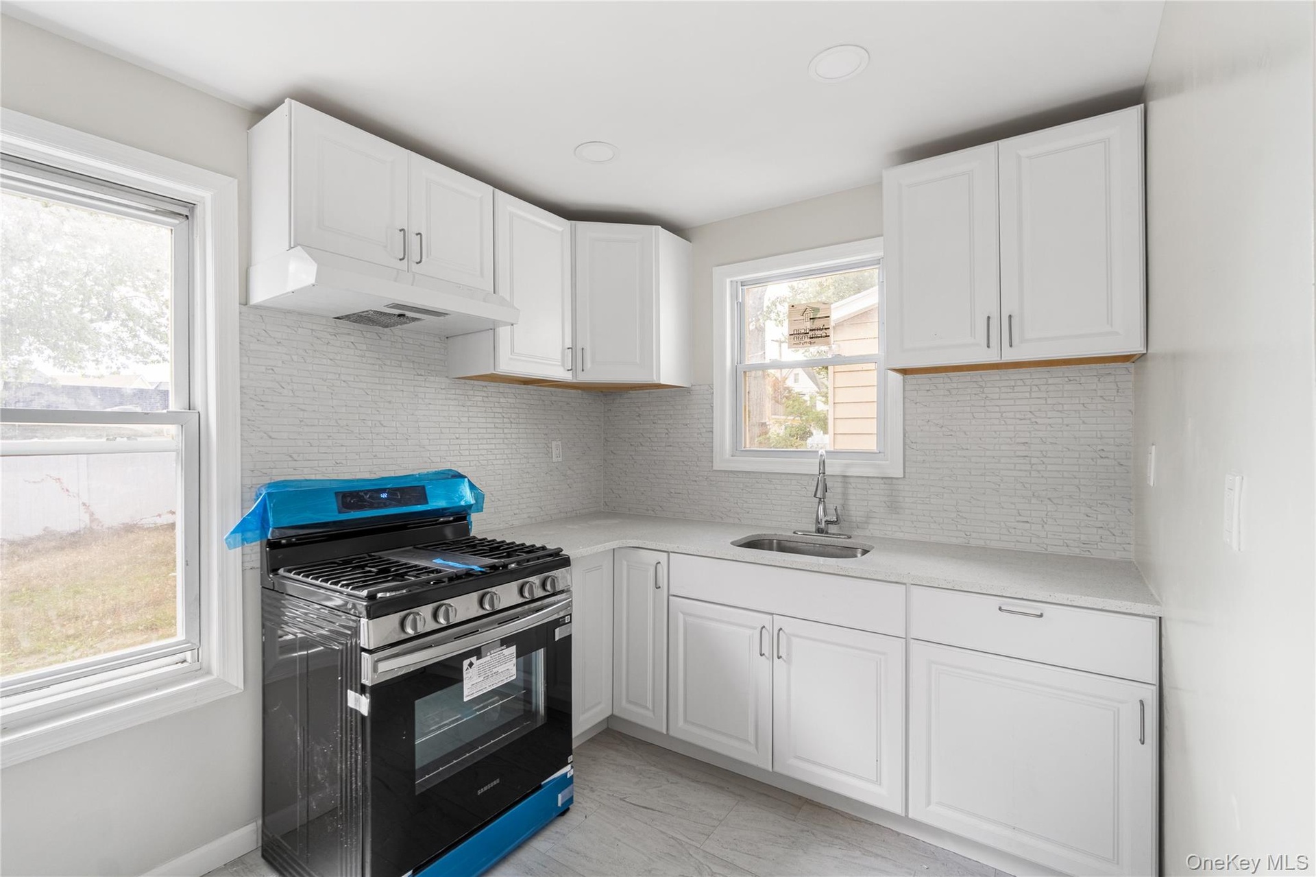 - Kitchen with range with gas cooktop, under cabinet range hood, backsplash, white cabinetry, and light stone counters