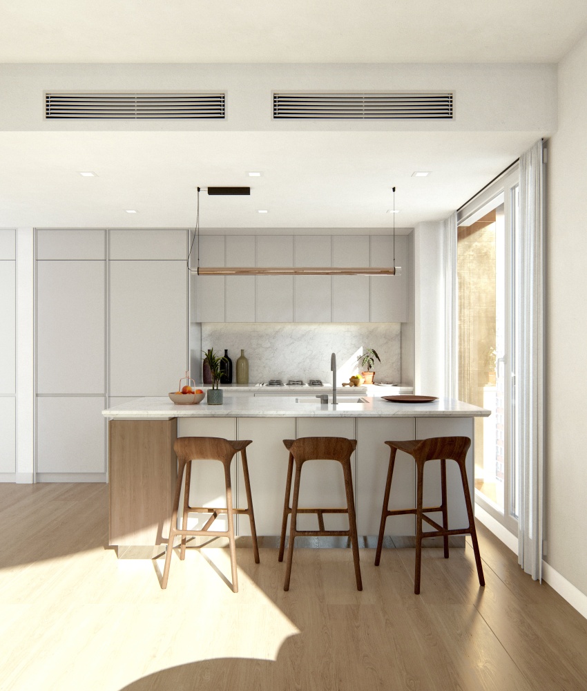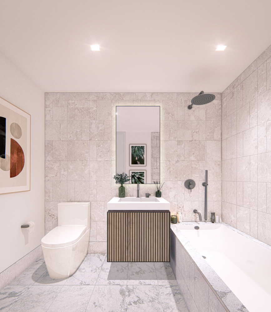 The primary bath is a haven of comfort and tranquility, featuring custom-built oak vanities, Bianco Sivec marble walls, and radiant-heated flooring. Additional apartment features include eight-inch plank oak flooring, abundant closet space, and optional extra storage.