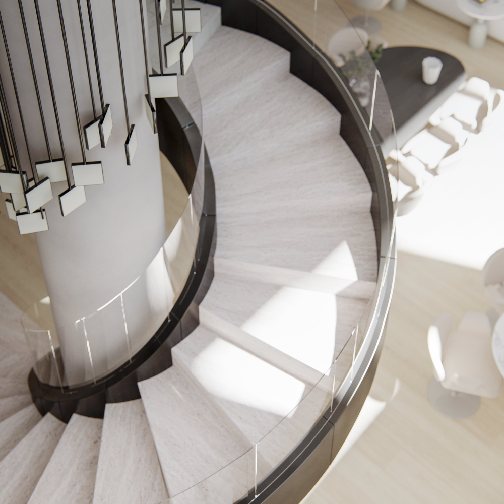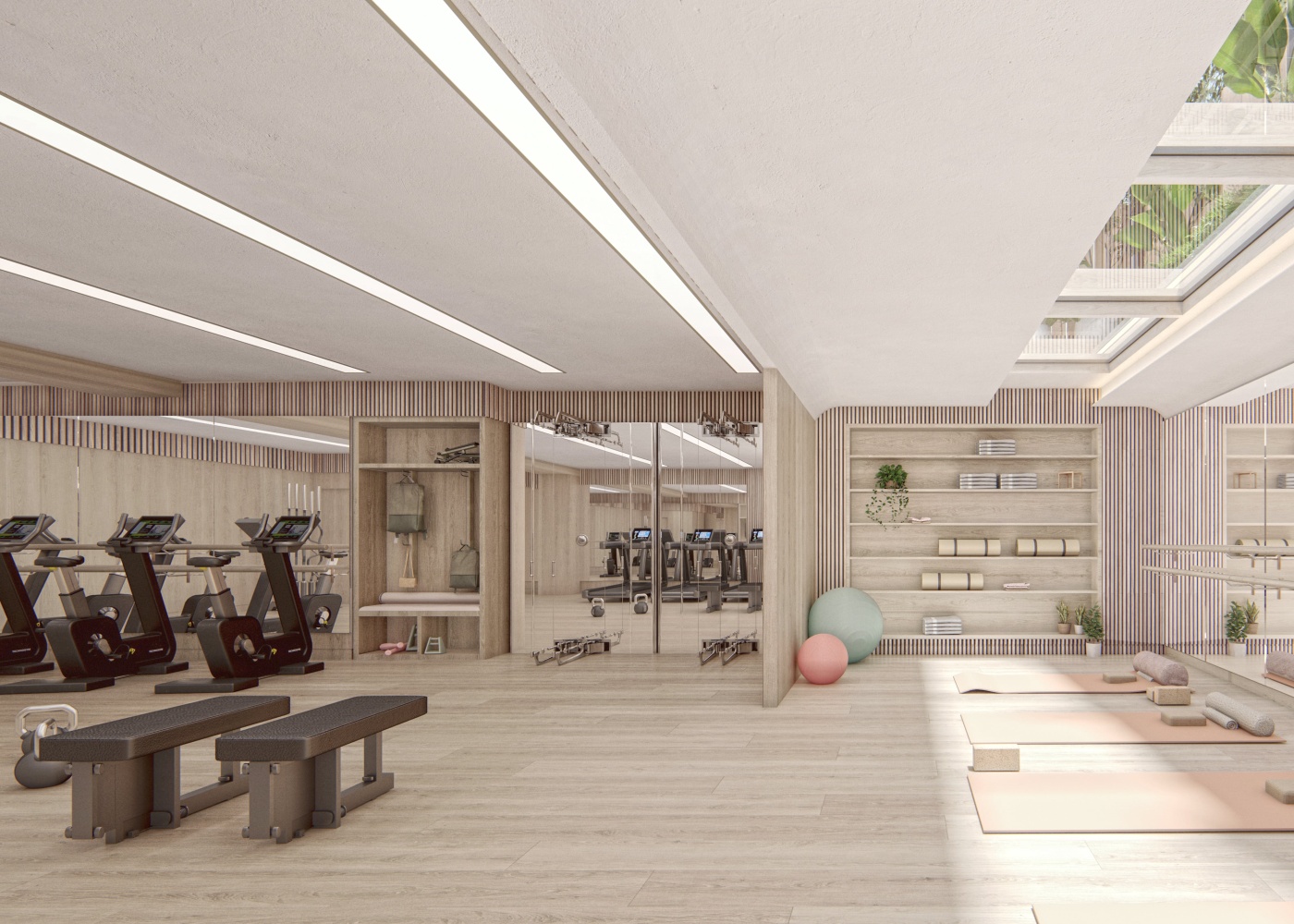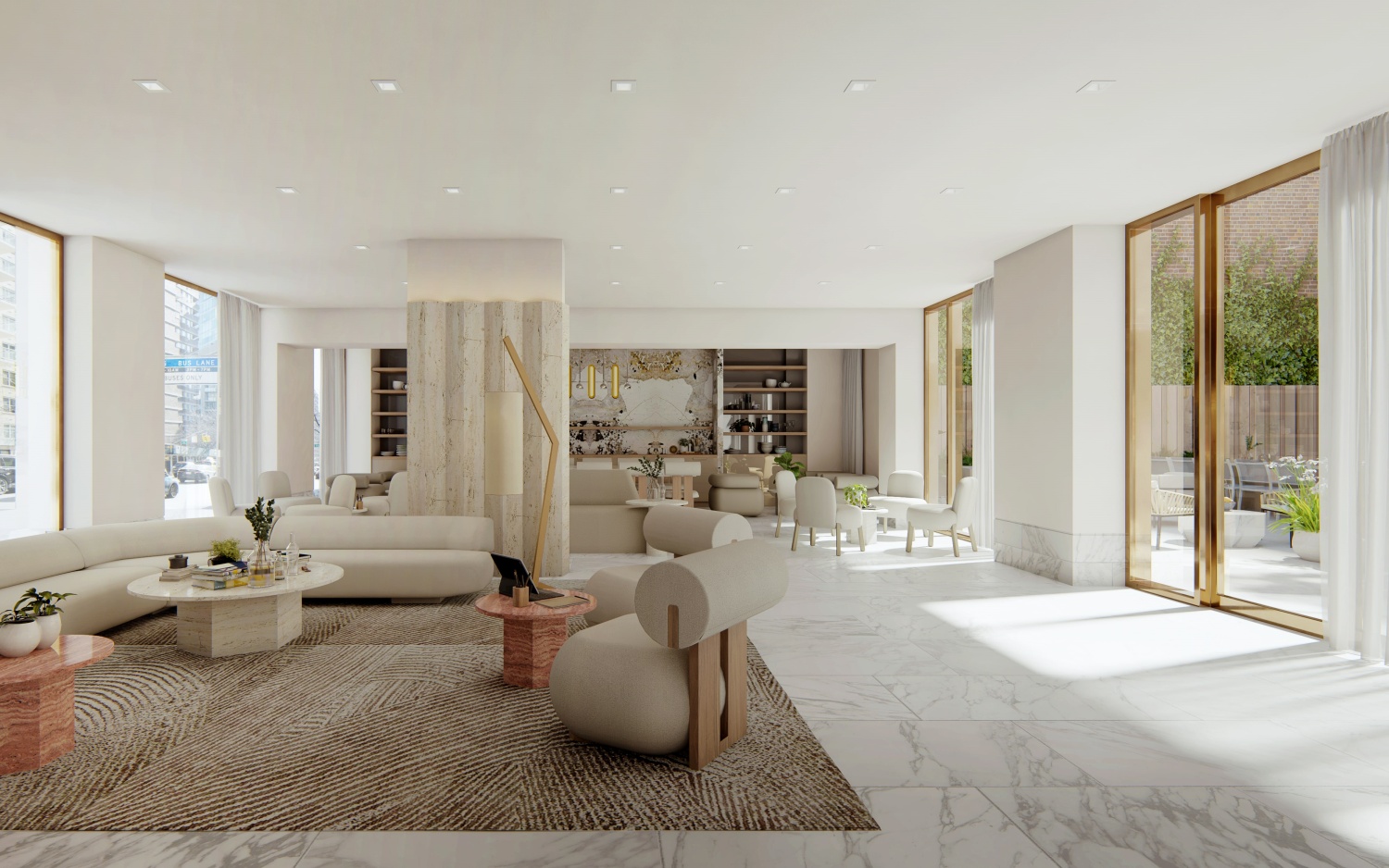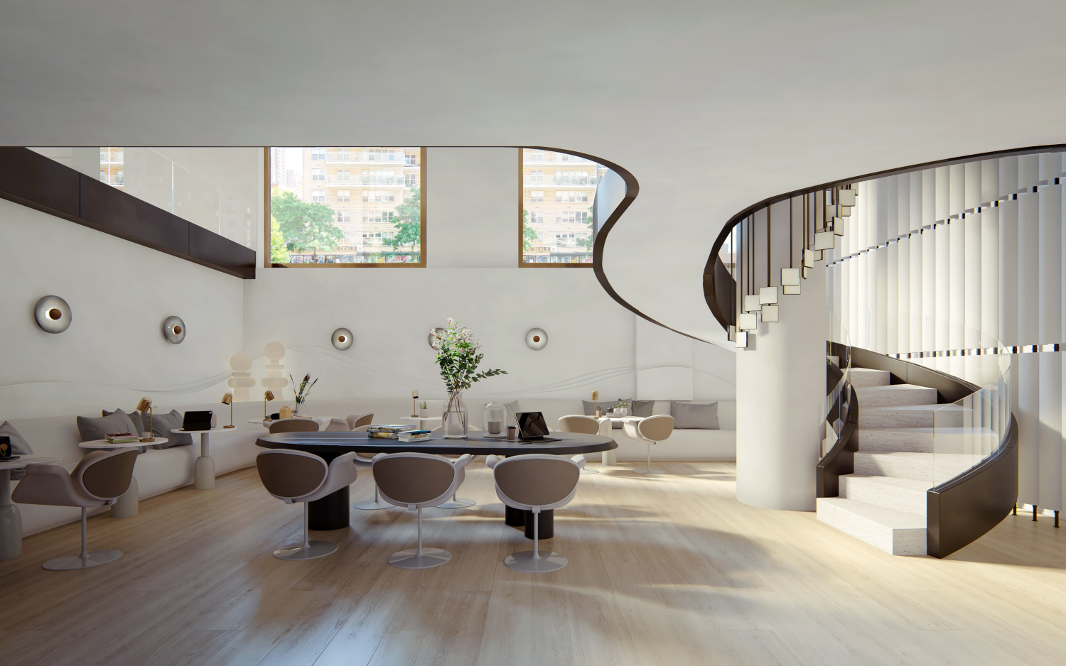 The double-height lobby welcomes you into a world of elegance, leading to the resident lounge and a beautifully landscaped courtyard with outdoor seating. Here, residents can socialize, relax, or entertain in style, both indoors and outdoors. Descend the spiral staircase to find the state-of-the-art fitness center with cardio machines, free weights, and a private yoga studio. The wellness spa is adjacent to the fitness center, complete with a steam room and sauna, featuring slip-free teak flooring, a cool-off shower, and towel service. Additionally, residents can enjoy a landscaped rooftop terrace equipped with barbecues, lounge chairs, and dining areas.