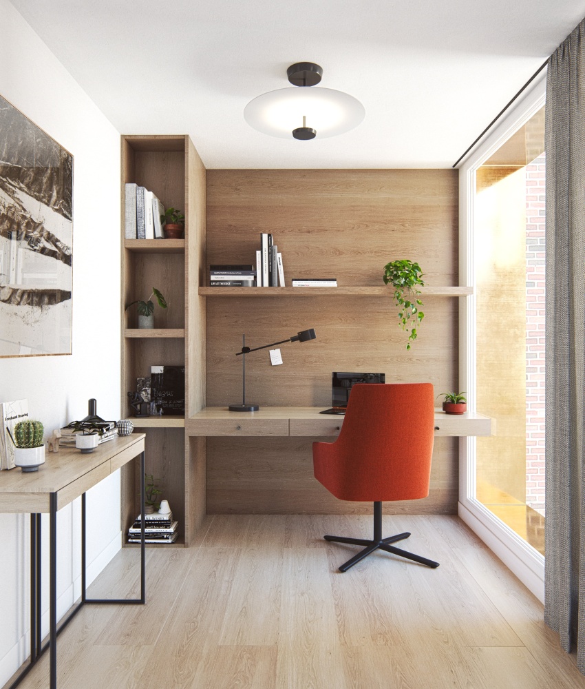 Each home boasts a custom-designed office, meticulously crafted with precision millwork, an efficient shelving system, and a desk with soft-close drawers. Seamless grommets for cord management enhance the organization and beauty of these artfully designed workspaces, elevating your professional environment.