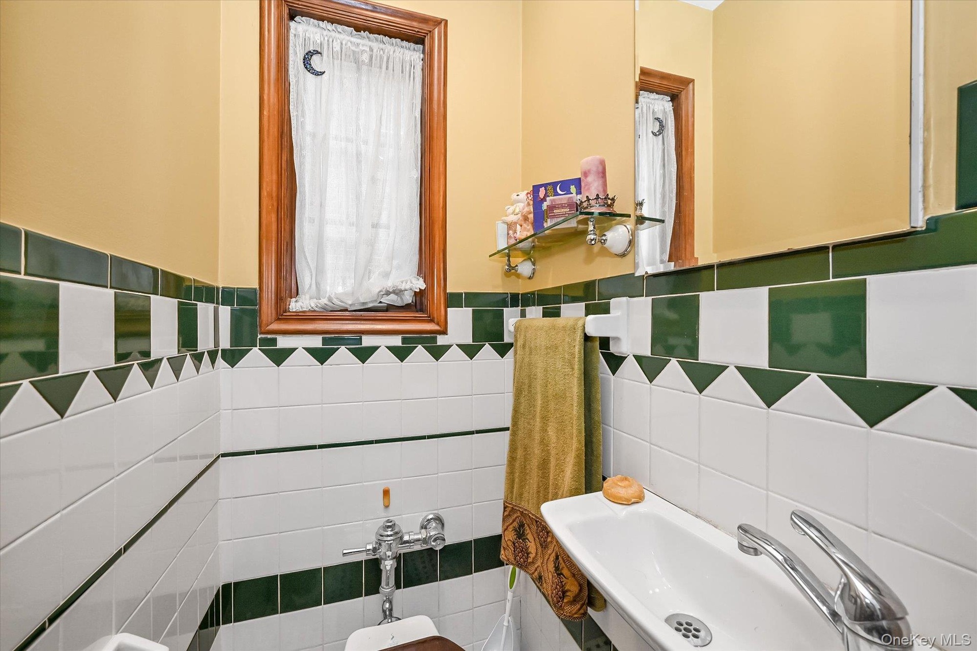 - MS Bathroom with tile wall and floor, a new porcelain sink and tub, stain glass window