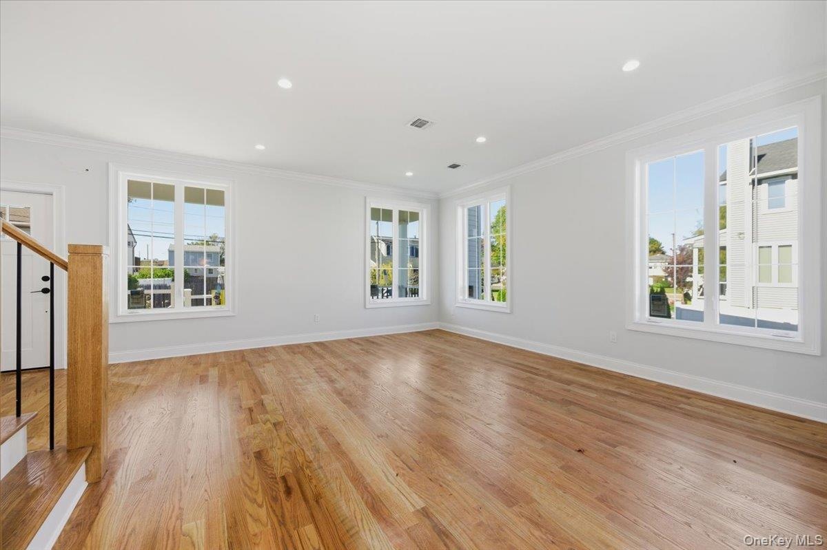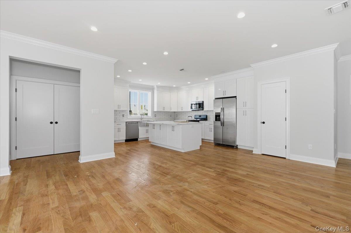 - Unfurnished living room with ornamental molding, light wood-style flooring, and recessed lighting