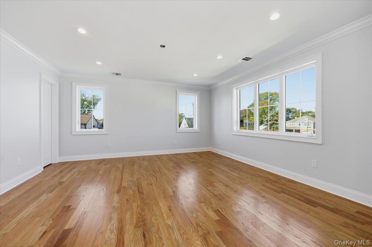 - Empty room with ornamental molding, light wood finished floors, and recessed lighting
