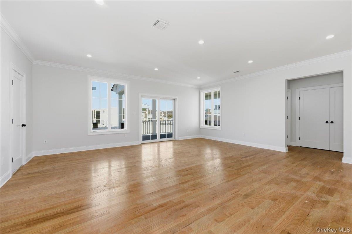 - Unfurnished living room with light wood-style floors, crown molding, and recessed lighting