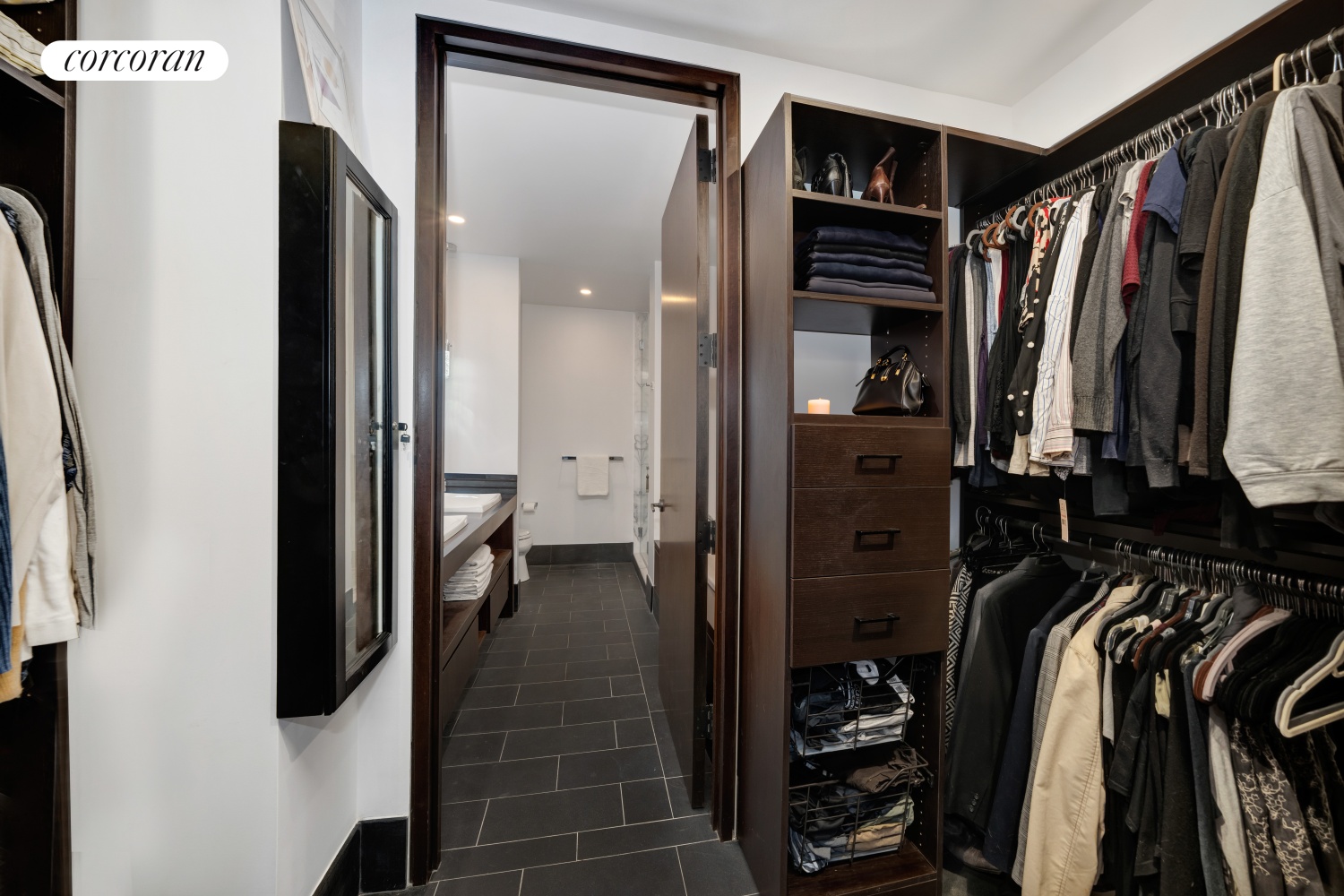 The gracious entrance foyer features a custom California Closet alongside a conveniently located in-unit washer and dryer, offering exceptional storage and everyday convenience. A discreetly placed half bath adds to the home's thoughtful layout.