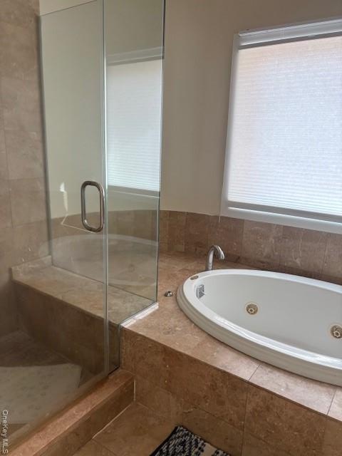 - Full bathroom with a tub with jets and a stall shower