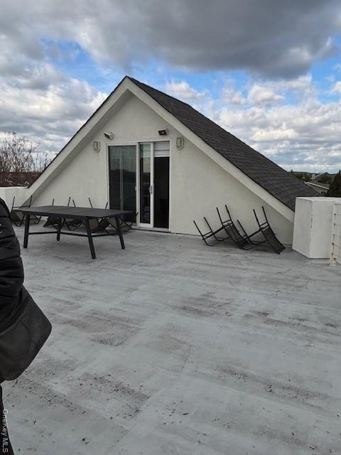 - Rear view of property with stucco siding and a shingled roof
