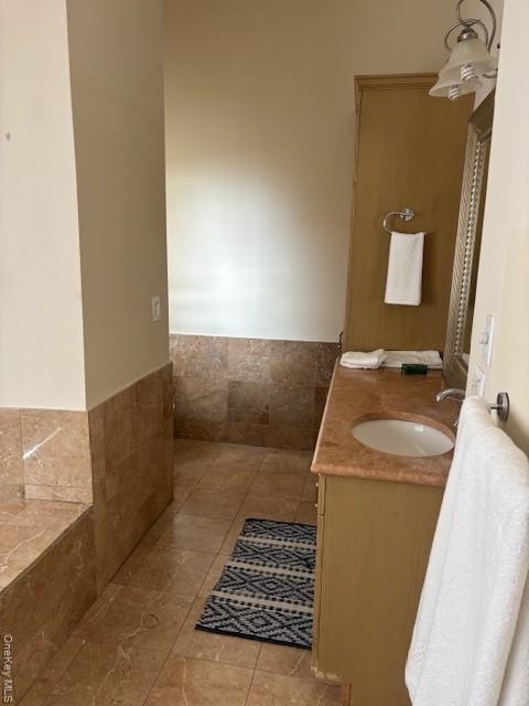- Bathroom with vanity, tile walls, a wainscoted wall, and light tile patterned floors