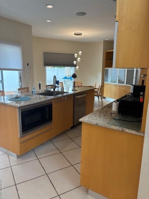- Kitchen with pendant lighting, light tile patterned floors, a kitchen island with sink, light stone countertops, and recessed lighting