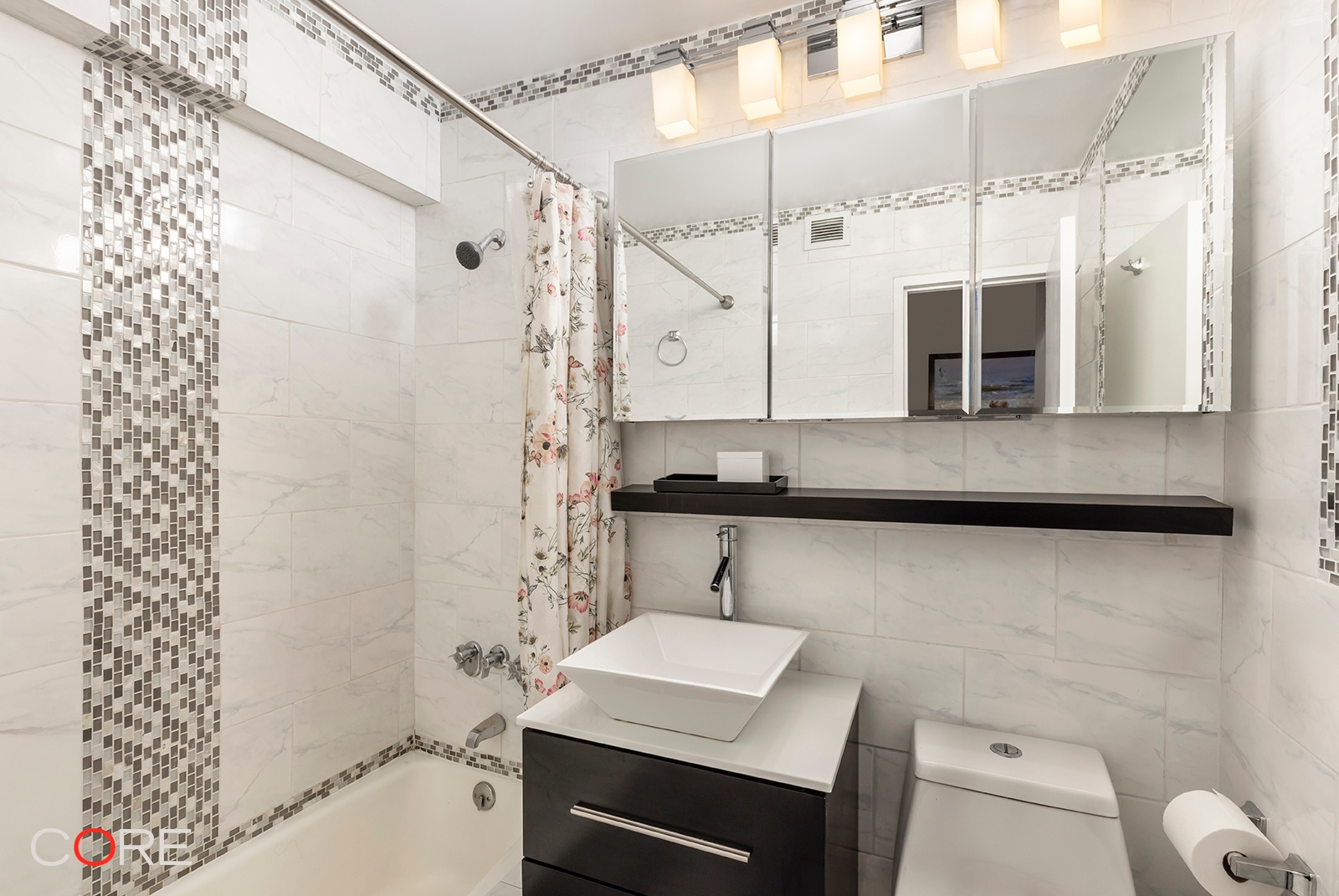 The three-fixture bathroom offers a combination shower and tub with custom tiling and shelving, a floating vanity with a vessel sink, and a wall of medicine cabinets with additional storage.