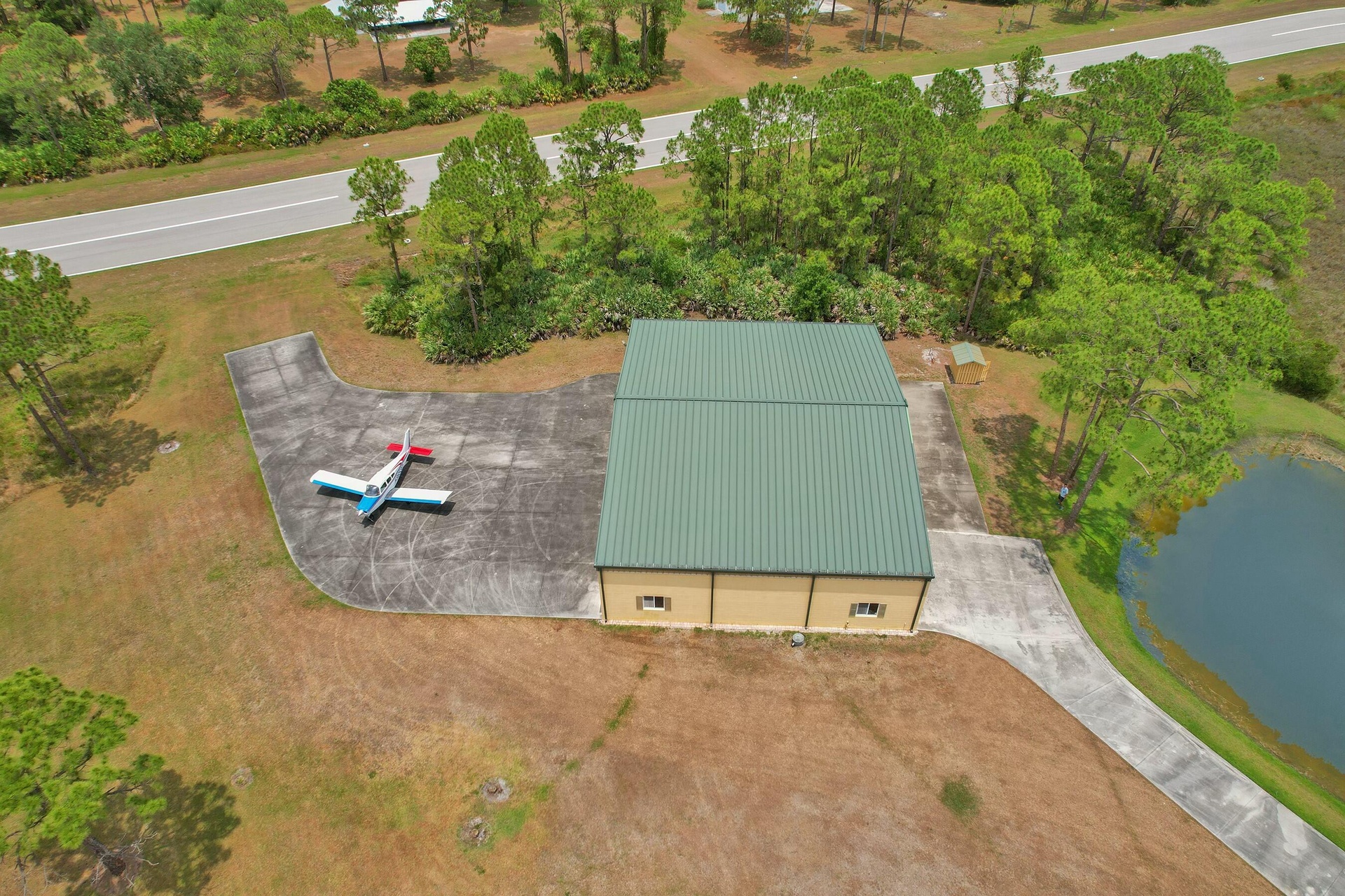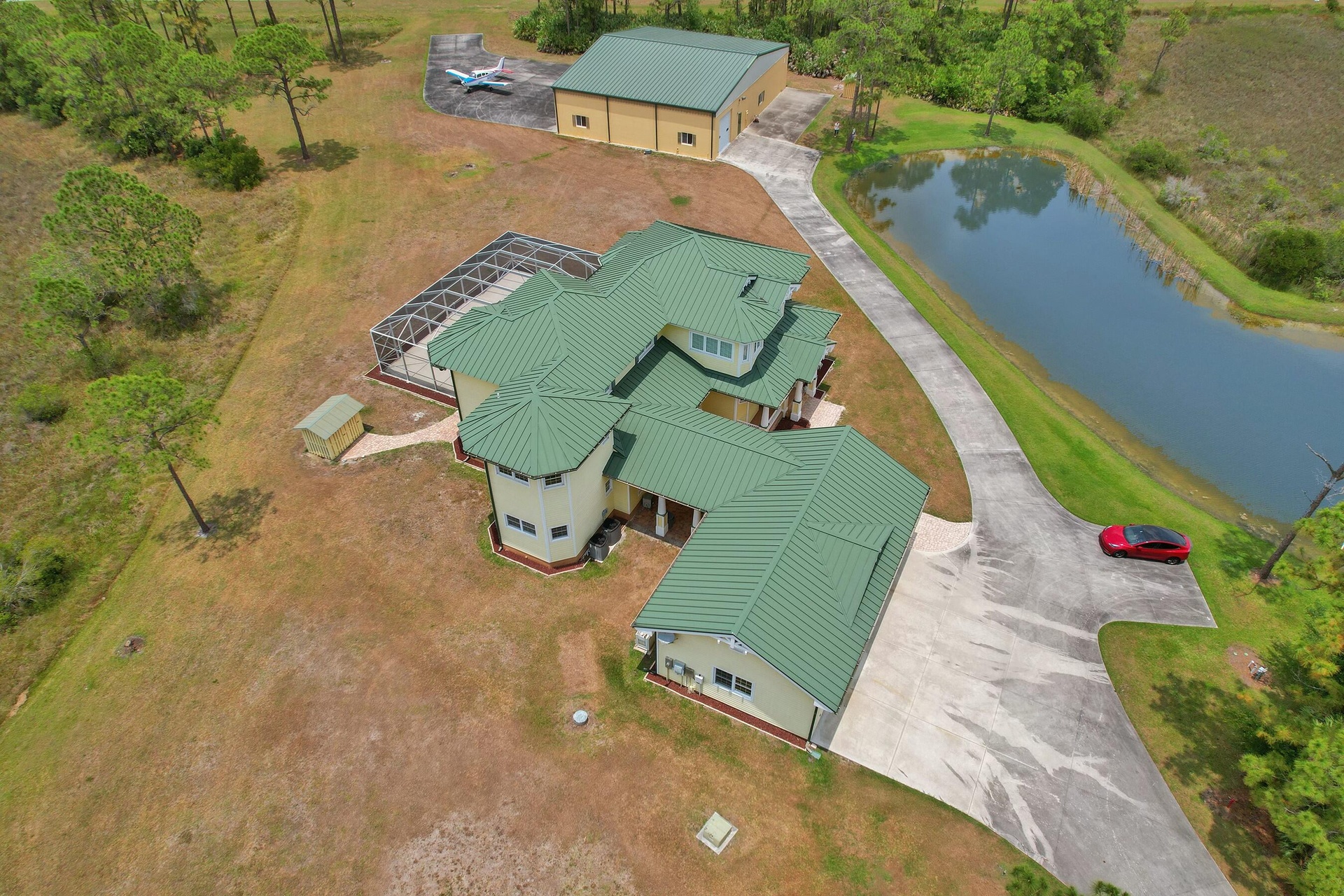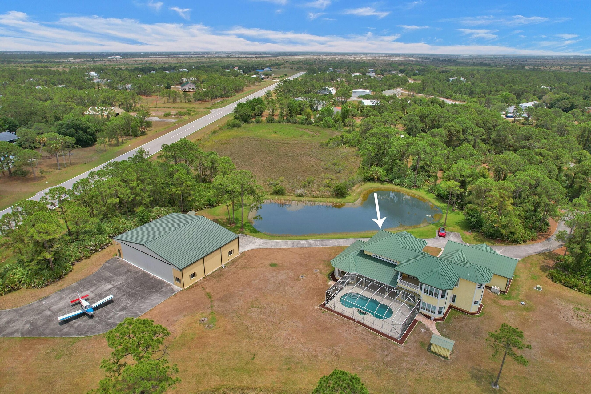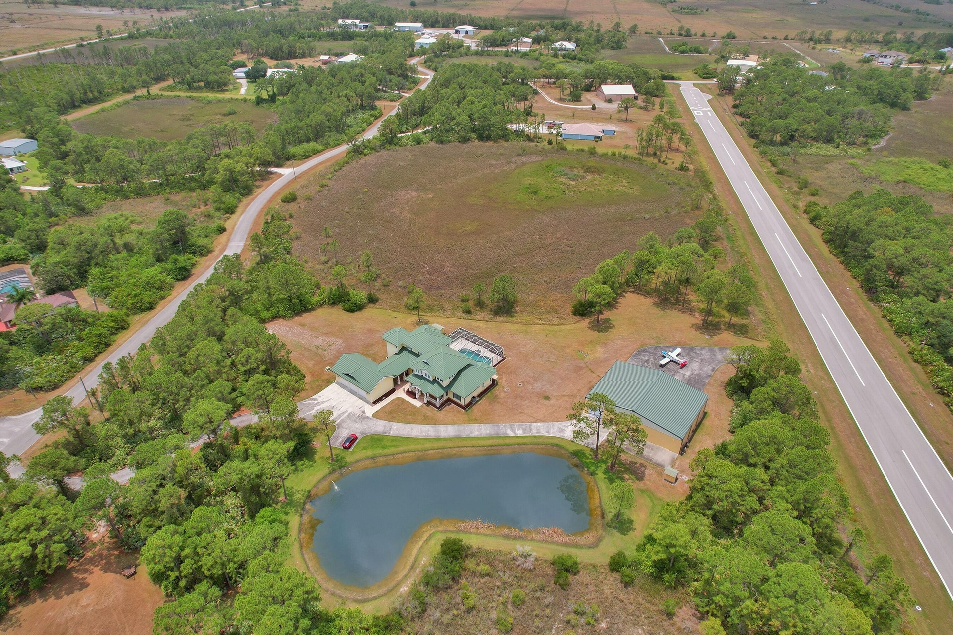 Welcome to an extraordinary aviation estate at 15350 Skyking Dr, located in the prestigious Treasure Coast Airpark (FL37) in Port Saint Lucie, FL. This remarkable property offers aviation enthusiasts direct access to a 4,067' x 48' paved and lighted runway (10-28), perfectly situated halfway down the runway for unparalleled views of aircraft taking off and landing. Property Highlights: Residence: - Spacious Living: 4 bedrooms and 3 baths, plus an outdoor cabana bath with a toilet and shower. - Expansive Grounds: 14.65 acres across 2 lots, providing ample privacy and room for outdoor activities. - Gourmet Kitchen: Featuring Slate countertops from Maine, a Miele oven, and an expansive walk-in pantry with abundant storage.