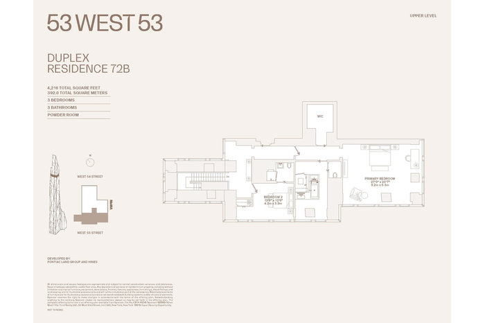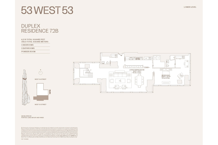 Duplex Residence 72B at 53 West 53 comprises 4, 216 square feet, offering three bedrooms, three and a half bathrooms, and south, north, east, and west facing exposures.