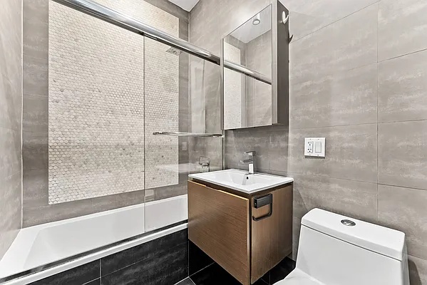 This apartment features a full bathroom with a deep soaking tub, along with two additional half bathrooms for added convenience. Natural light floods the space through oversized windows, highlighting the expansive living area and rich hardwood floors.