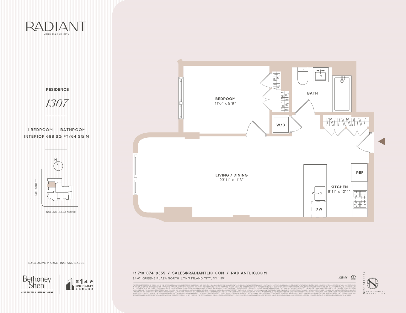Situated in an emerging residential enclave in Long Island City, Radiant is moments from numerous restaurants, bars, cafes, and shops. MoMA PS1, Brooklyn Boulders, Queensbridge Park, Target, and Murray Playground are all a few blocks away. Accessible subway lines include the 7/E/R/N/W/M/F. Pets are allowed.