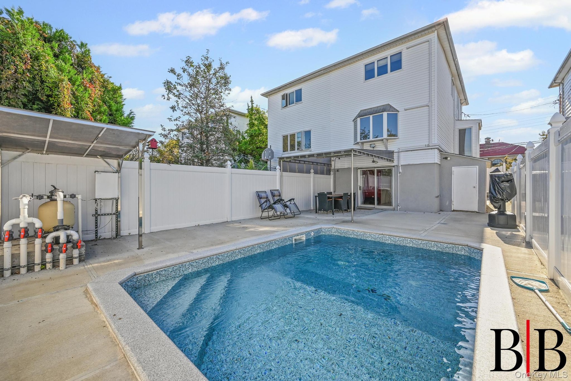One of Bergen Beach's finest properties awaits it NEW owner. Feast your eyes on this lovely semi-detached single family home. This beauty features a 3 bedroom duplex with first floor offering a renovated kitchen that has stainless steel appliances, granite counters , new cabinets plus 2 pantry's and with a center kitchen granite top island , that flows into the open concept dining & living room with a 1/2 bath for guest and convenience on this level. The top floor has primary bedroom with a custom wall closet , 2 other nice size bedrooms ,fully tiled bathroom with double sinks and hardwood floors throughout . This basement level has a open space family room all tiled with laundry room,3/4 tiled bathroom. There's a sliding door to private yard new PVC fencing around the entire property with a NEW inground salt water pool 16 x 11 in addition 2 sheds for more storage plus all new concrete in the back yard and front of house ,there is a new brick dividing wall. This entire home is energy efficient with a paid off solar panel system, motion sensor sinks, split unit ductless A/C and HEAT system. Fully floored and waterproof attic, perfect for storage. PLUS NEW electric and LED lighting that has hi-hats throughout the house. Private parking for 2-3 cars and just a real GEM that won't LAST long...