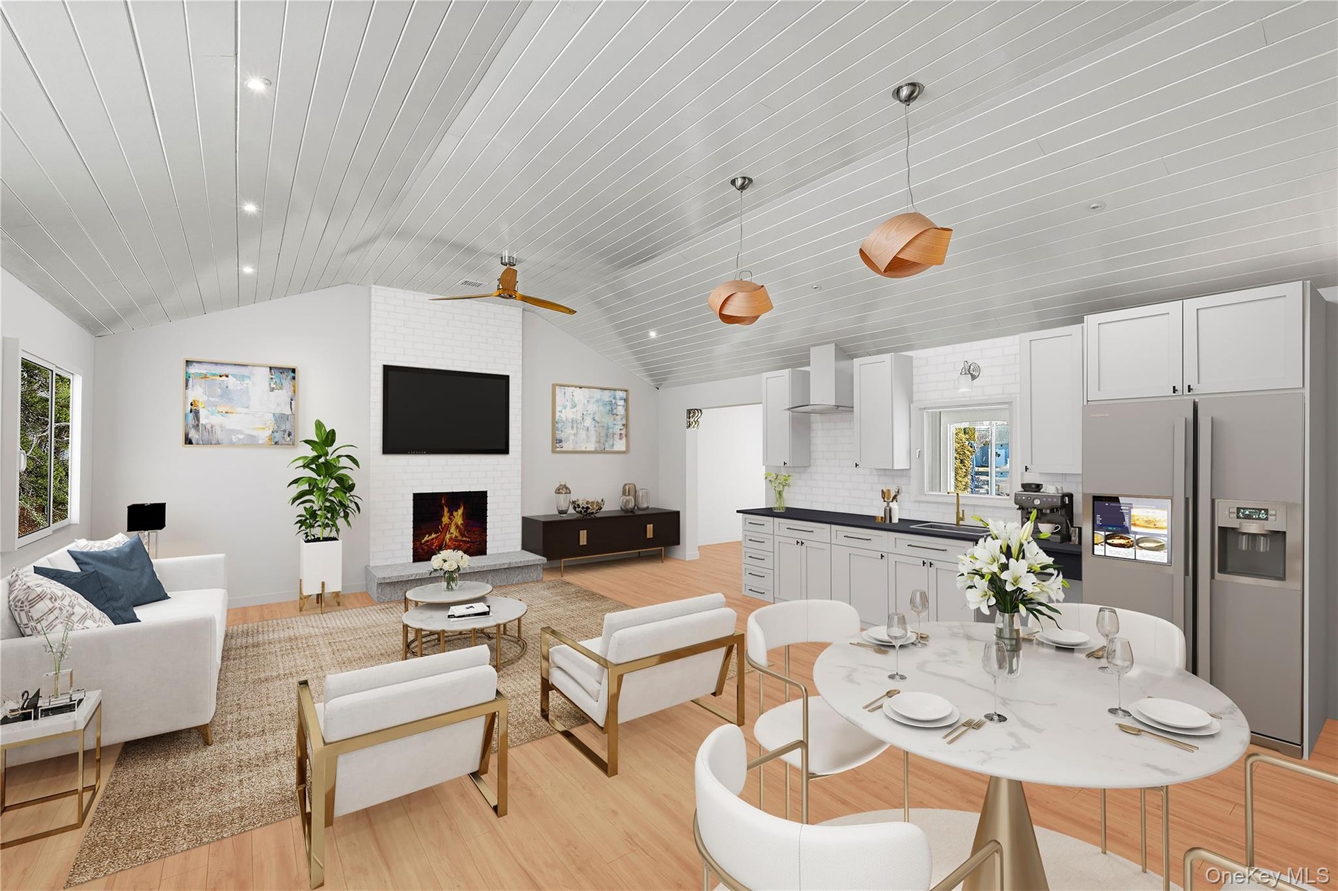 Recently renovated , this ideal Hamptons waterfront home seamlessly blends modern luxury with coastal charm. The open-concept design features a stunning new kitchen with high-end appliances, a wonderful open layout , and vaulted, shiplap ceilings that frame the cozy fireplace. Natural light pours into the bright living and dining areas, which flow effortlessly onto a covered porch—perfect for soaking in the serene water views.