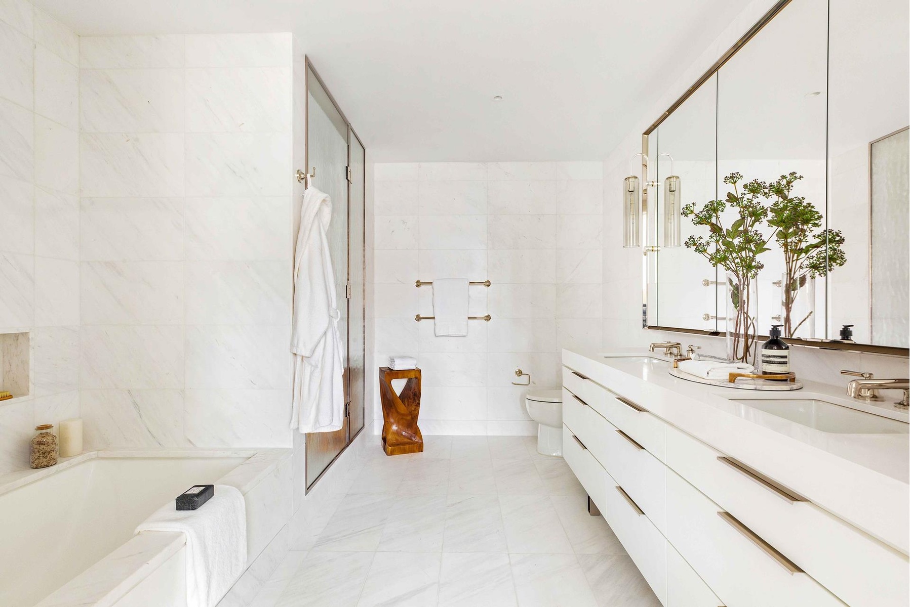 The primary bedroom suite features a large walk-in closet and a thoughtfully finished ensuite five fixture bath with Venus White marble tile floor and walls, custom-designed millwork vanity clad in a leathered textile, custom-designed medicine cabinets and wall sconces, and polished nickel fixtures by Waterworks.