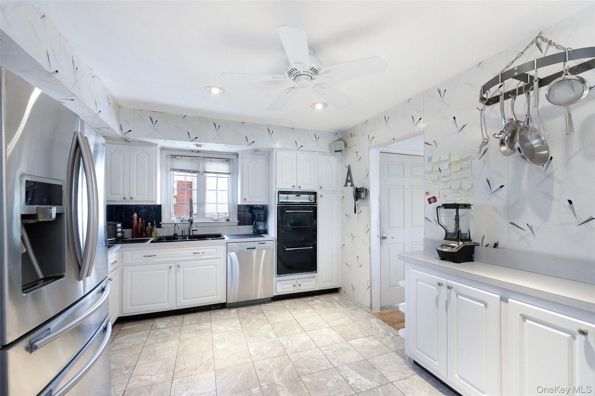 - Kitchen featuring tasteful backsplash, white cabinets, a ceiling fan, stainless steel appliances, and a sink