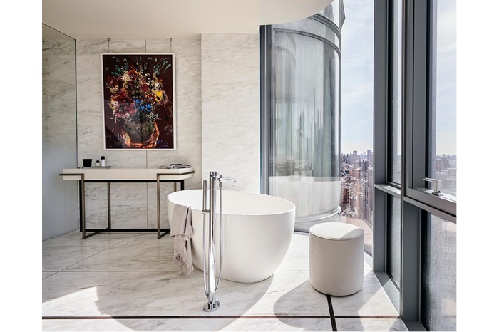 This gracious, light-filled, 2,191 square foot, 2-bedroom, 2-and-a-half-bathroom residence with 10" ceilings and 6-inch wide-plank white oak floors throughout, showcases north- and east-facing panoramic city views of Midtown and historic SoHo. A private, keyed elevator enters a dramatic gallery that is over 25 feet long - designed for displaying art and entertaining which then leads to a corner great room and an open kitchen ideal for both entertaining and everyday living. Floor-to-ceiling glass wraps the home allowing for abundant natural light and enhancing the spectacular north- and east-facing vistas through the curved facade.