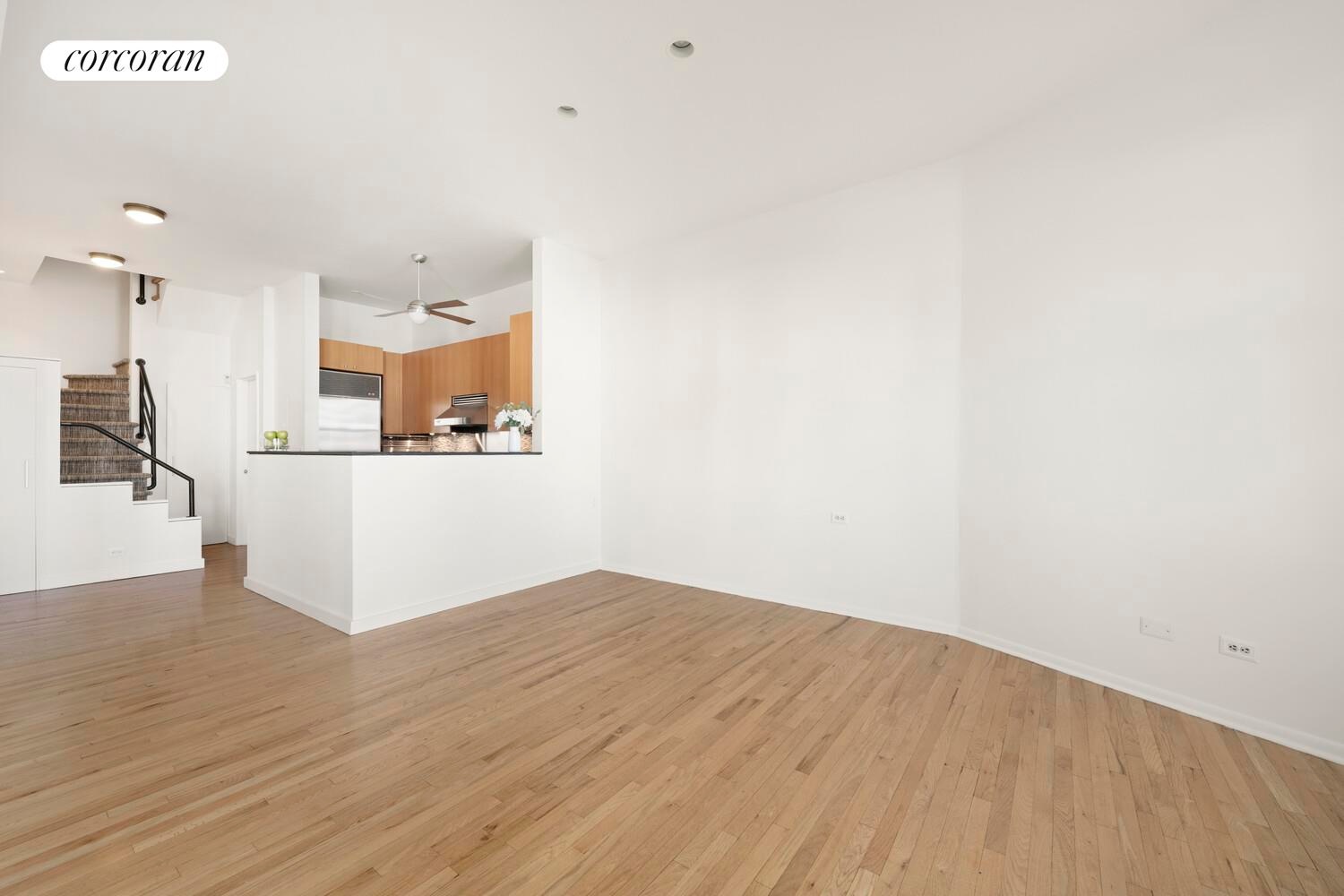 The main entry level features an open cook's kitchen with stainless steel appliances, honed black granite countertops and beautiful pearwood cabinets. The open loft like living and dining area benefits from a stunning western exposure that floods the home with natural light and is perfectly proportioned for everyday living and entertaining in style alike. Additionally, there is a recently renovated bathroom on this floor and tremendous storage space under and around the staircase that leads to the upper bedroom floor. There you will find an oversized renovated bathroom with ample storage and counter space, a hall closet with washer and dryer and two generously sized bedrooms with soaring ceilings and sensational western views of City Hall Park. This lofty home is a downtown dream come true, in move-in condition and with a great layout which offers an ideal separation of space between public and private rooms.
