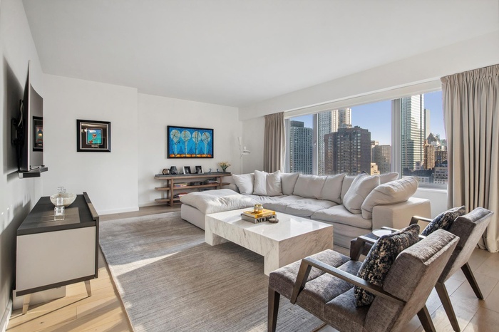 Introducing a stunning 1,728-square-foot corner residence with two bedrooms, two bathrooms, and a powder room, graced with modern, elegant interiors by Messana O'Rorke. High 9-foot ceilings and 7-inch white oak plank flooring set a sophisticated tone throughout this high-floor home, where expansive southern and eastern exposures fill the space with abundant light and offer breathtaking open city views along with partial river vistas.