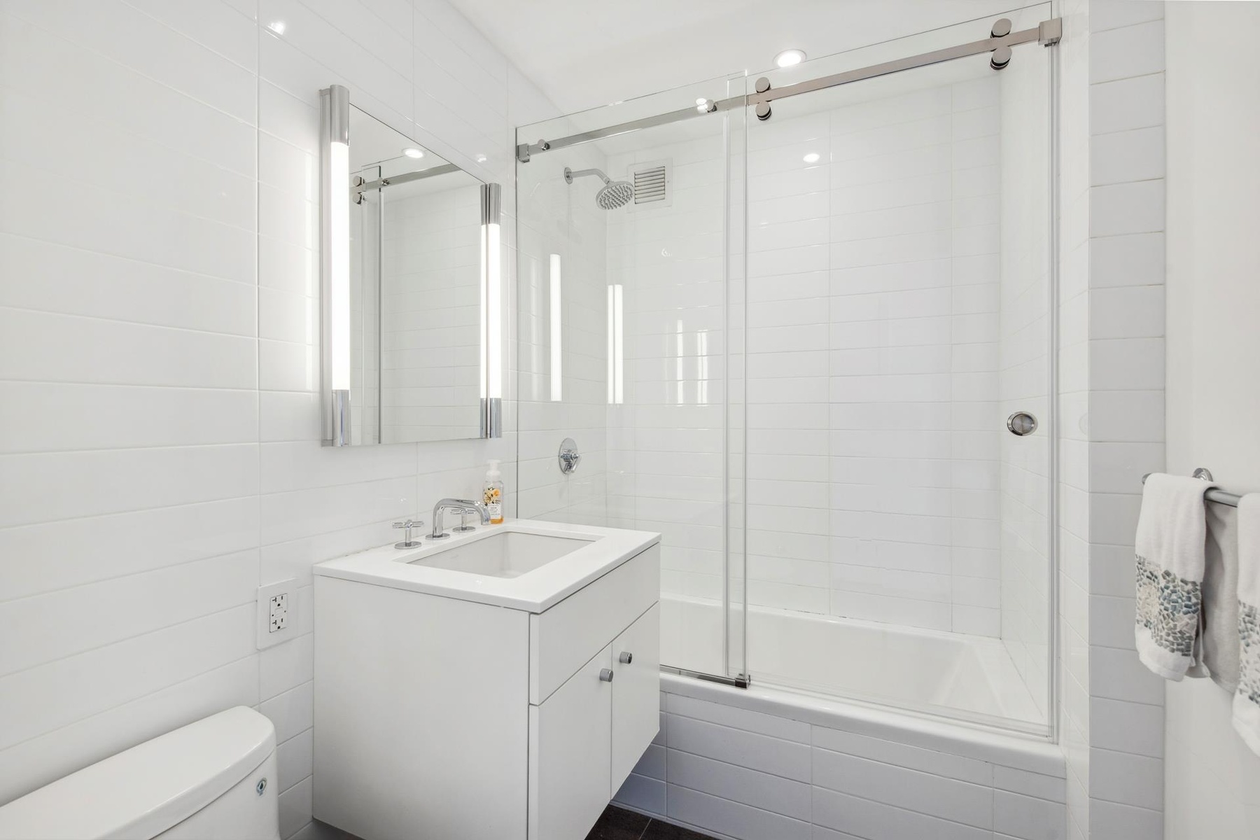 In the east-facing Master Suite, you'll find four spacious closets and an en-suite bathroom designed with radiant heated floors, marble countertops, a custom glass-enclosed shower, and Waterworks fixtures. The Second Bedroom, also with en-suite bath, boasts eastern exposure, a spacious walk-in closet, Basaltina stone flooring, and white ceramic wall tiles.