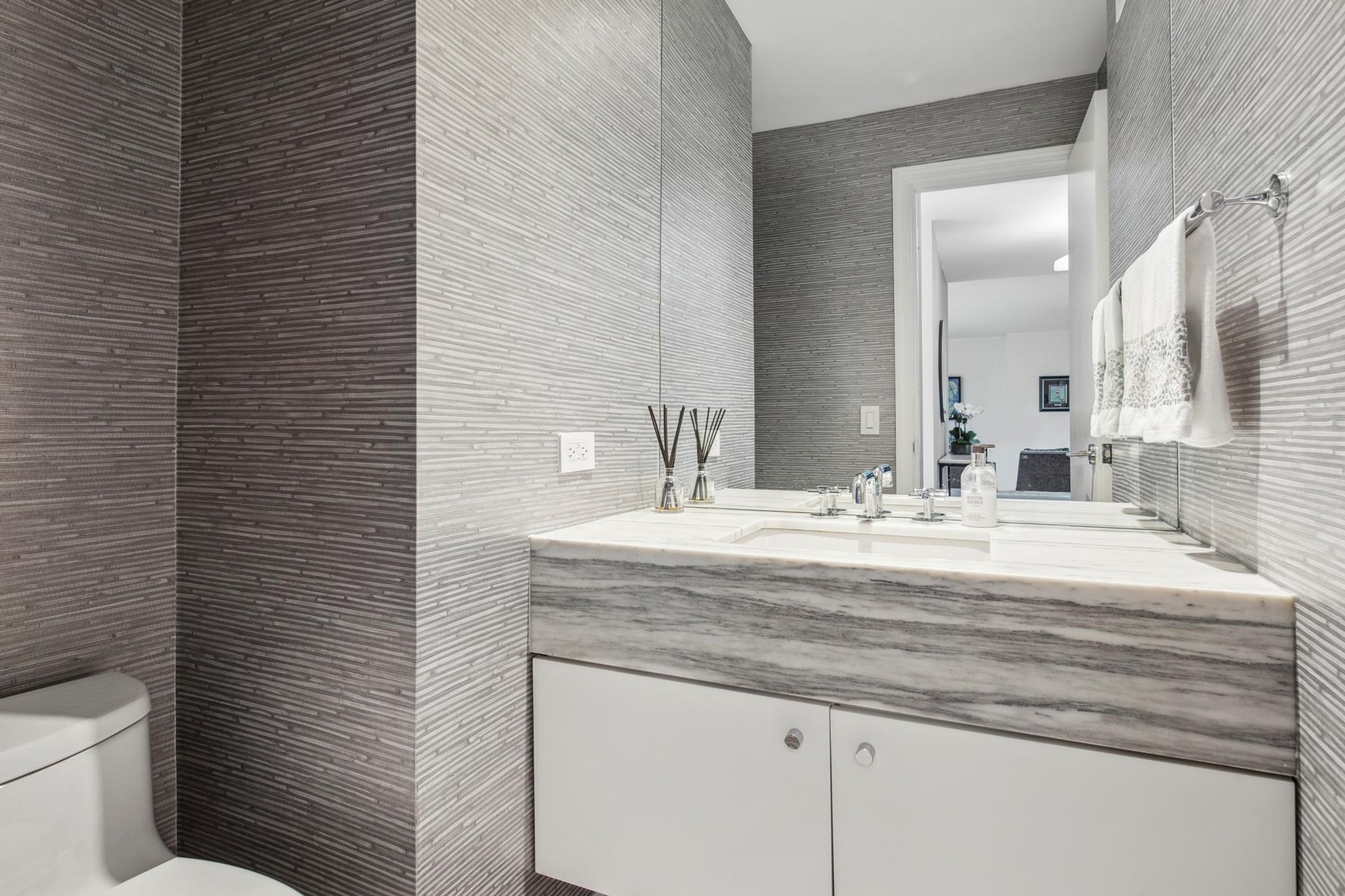 The thoughtfully designed Powder Room is finished with white oak flooring and a marble vanity, adding a refined touch to this impressive residence. Additional conveniences include a Miele washer and dryer, making this home both elegant and functional.