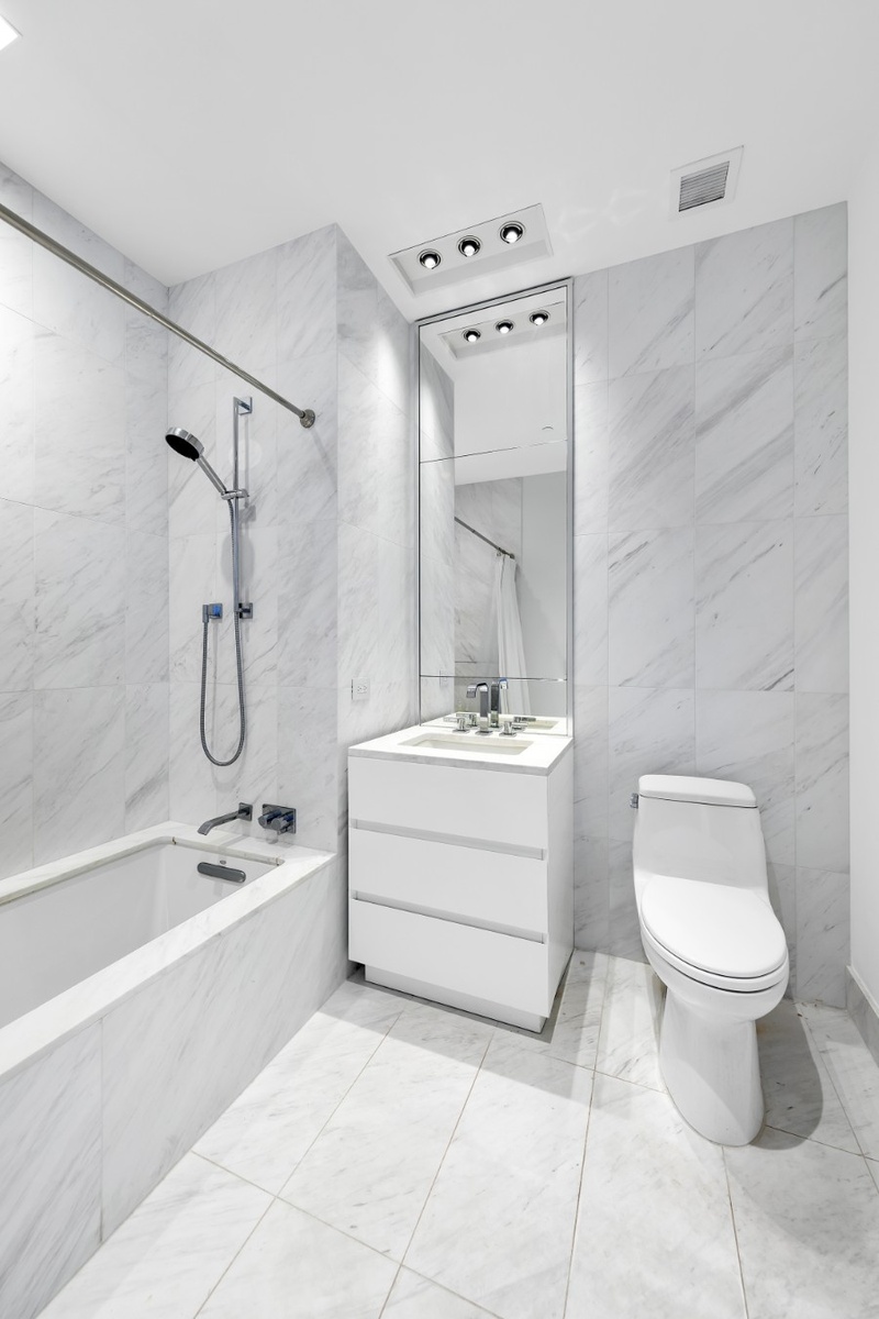 Retreat to the palatial primary suite, where a generous customized dressing room closet and a primary bath adorned with radiant heated floors, travertine stone slab feature walls, and custom white marble slab double vanities, set the stage for indulgence. An exquisite BluStone soaking tub, strategically positioned to capture south-facing views through a full-height window, adds a touch of opulence. Imagine yourself in a relaxing bubble bath after a long day in your spacious Soaking tub while enjoying the most breathtaking sunsets reflecting off of your view of the Freedom Tower and the Hudson River. The primary suite also includes custom motorized shades.